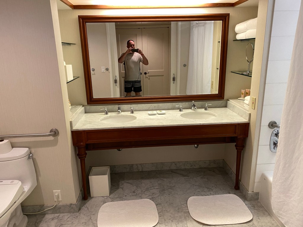We headed back to the Hyatt, and because it was still pretty early, we were able to grab shaded loungers right by the water slide pool. I went to get our new keys and find our day room. It was an accessible room with a view of…the parking lot. Even that room had all the same new bathroom fixtures as our suite (except there was a shower/tub combo). I’ll share the pictures of our suite tomorrow in my review of the Grand Hyatt.