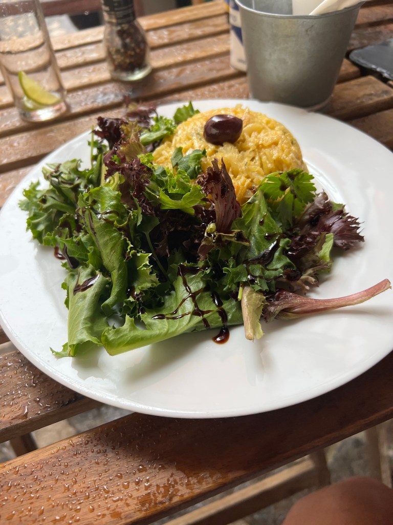 Once we were in town, it started raining. At first it was just drizzle, but it started pouring so we found a mostly covered place for lunch called Villa 6. The food and drinks were fine, but they annoyed me by not taking credit cards if you spend under 50 Euros. Luckily, I had just enough Euros left to cover it.