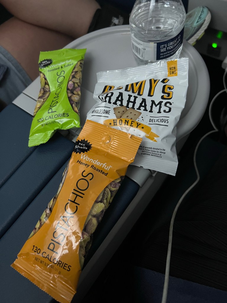 We boarded on time and pushed back about five minutes early. It was a smooth and uneventful flight, with a pre-departure beverage, drinks served in real glassware and a choice of snacks from the snack basket. There are no meals on these flights as they are under 900 miles, Delta’s threshold for First Class meal service.