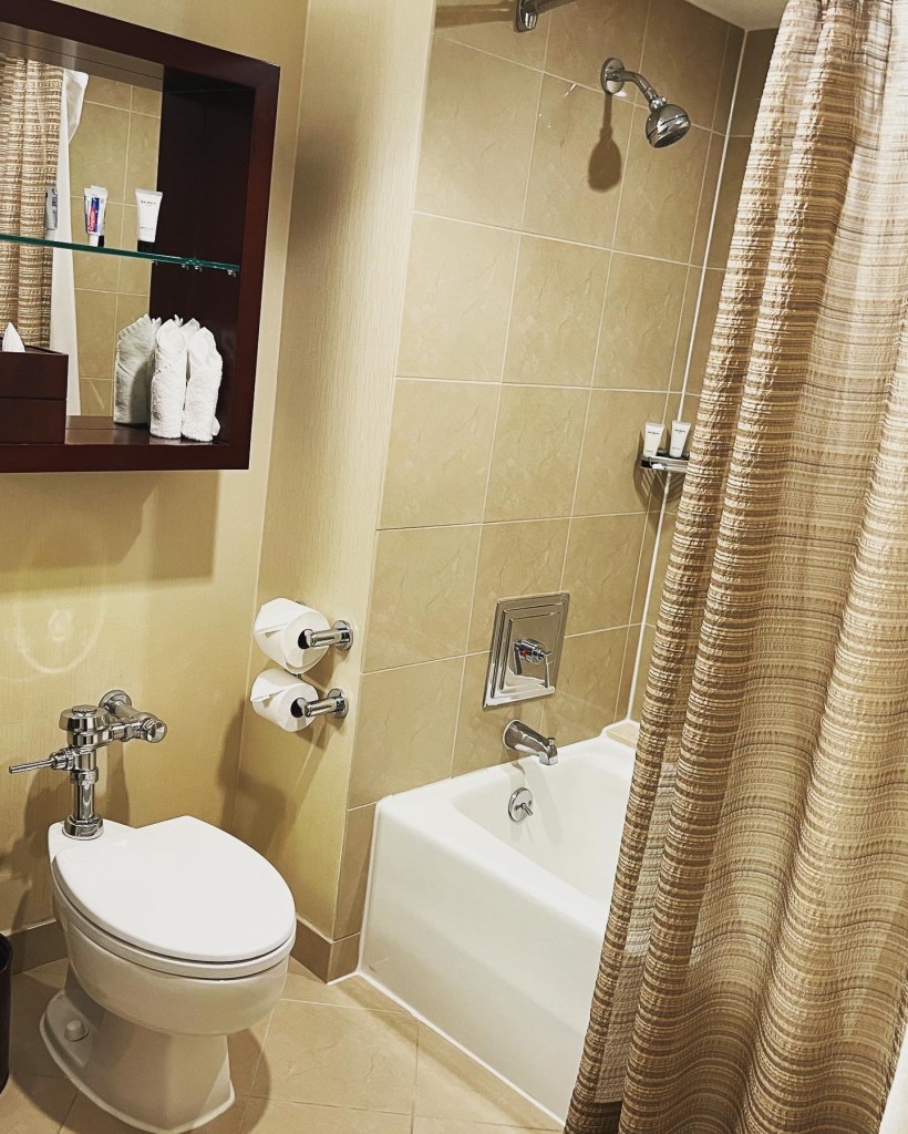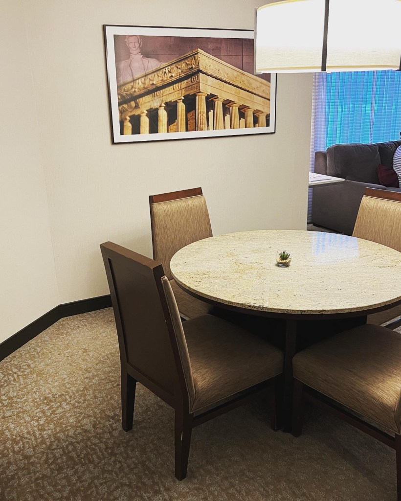 The suite was a bit weird, but at least there were two bathrooms and plenty of room for our daughter to hang out and do some work while we were staying out of the heat. My daughter and I also walked over to nearby Chopt for a quick lunch.