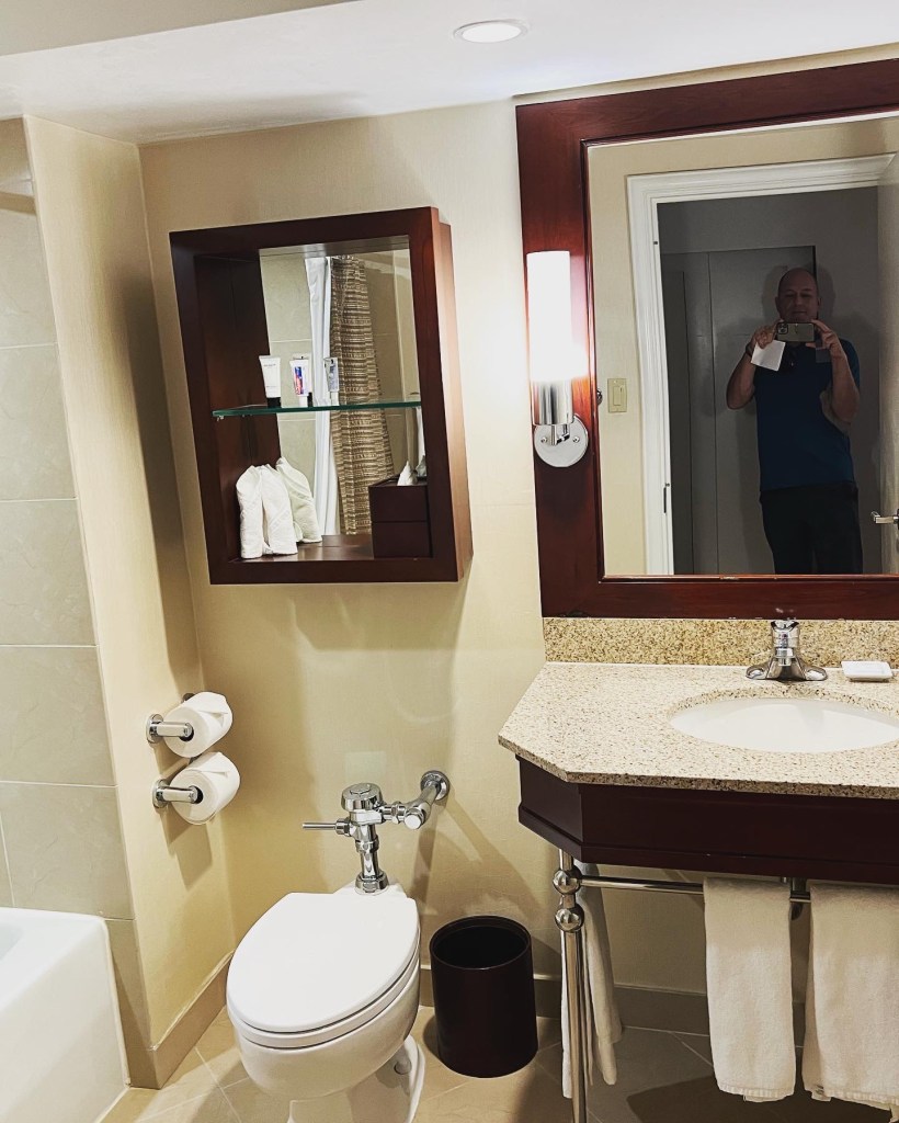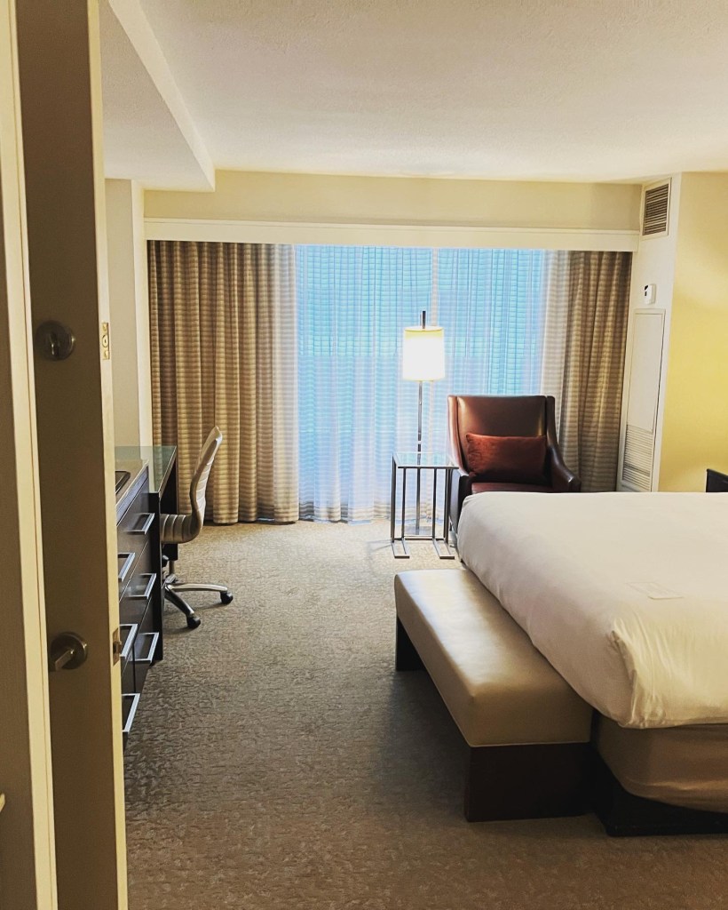 We arrived in an Uber from the Park Hyatt around 10:30am and our suite was not quite ready. I had texted the hotel in advance to see about a suite upgrade and they had confirmed a conference suite, which is technically a premium suite, but as you will see, it’s more like adjoining rooms. The hotel is designed in that 80’s atrium style. It takes up half a city block and has something like 600 rooms, but the entire interior is an atrium opened all the way to a skylight so there’s plenty of natural light during the day.
