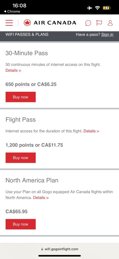 Given the bad weather, our flight was surprisingly smooth. I ended up buying internet access to help pass the time and Air Canada allows you to use miles at about 1cpp instead of paying cash. It’s a great idea and I can’t believe Delta hasn’t done this yet as they are always looking to get people to part with SkyMiles at 1cpp or less.