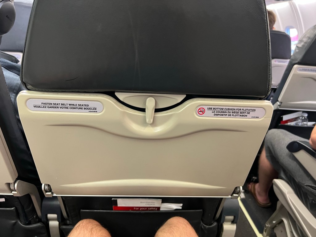 We were on an ancient CRJ900 with no in-seat power, no IFE and tiny overheads. Our bags fit OK, but some people had to put their rollaboards under the seat in front of them.