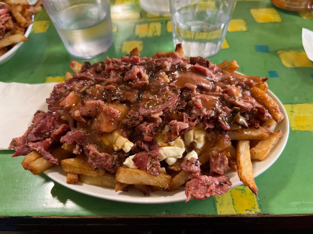 La Banquise – I wanted to try poutine, and this is the place to do it. They have it prepared tons of different ways. I tried the one with smoked meat and it was delicious. We also tried a good local beer. There was a 30 minute wait for a table at 1:30pm. No reservations are accepted here.