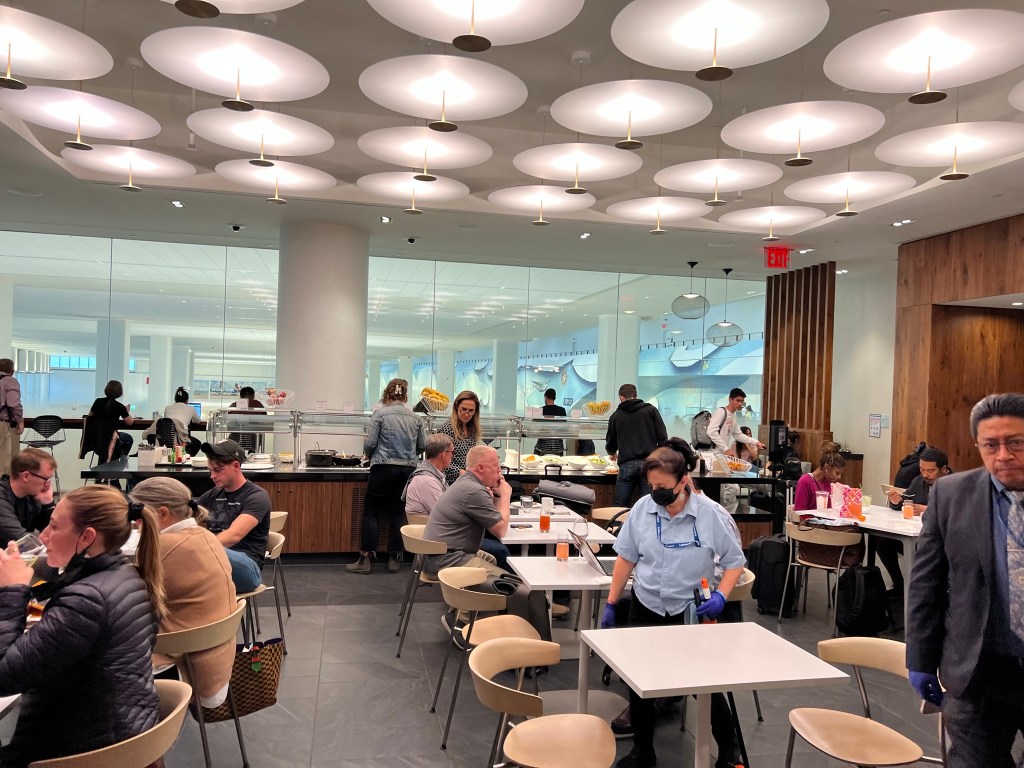 I walked around until I found an empty cubby seat at the far end of the lounge that had its own small table and charging outlet. I’m not a big fan of the way Amex lays out the lounges with the divided rooms instead of one large room like most airline lounges. I feel that it takes away even more valuable seating space without adding anything to the lounge’s ambience or reducing the noise level.