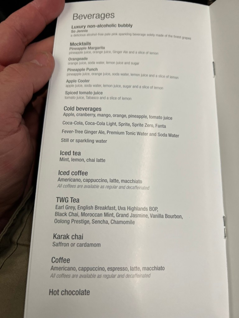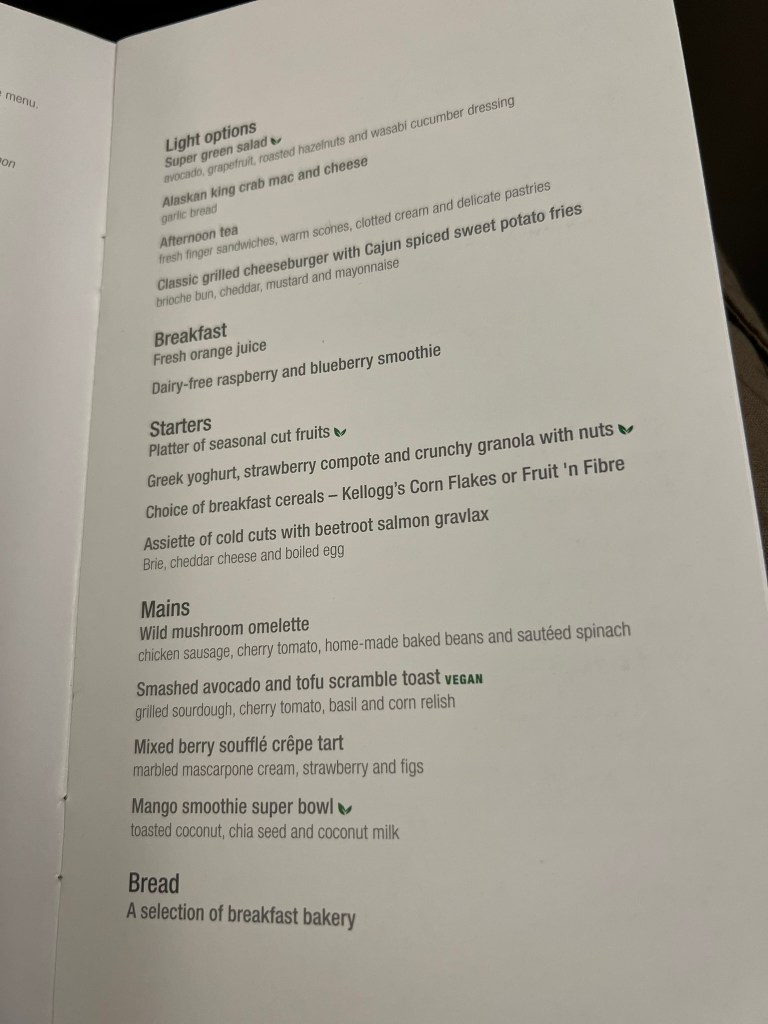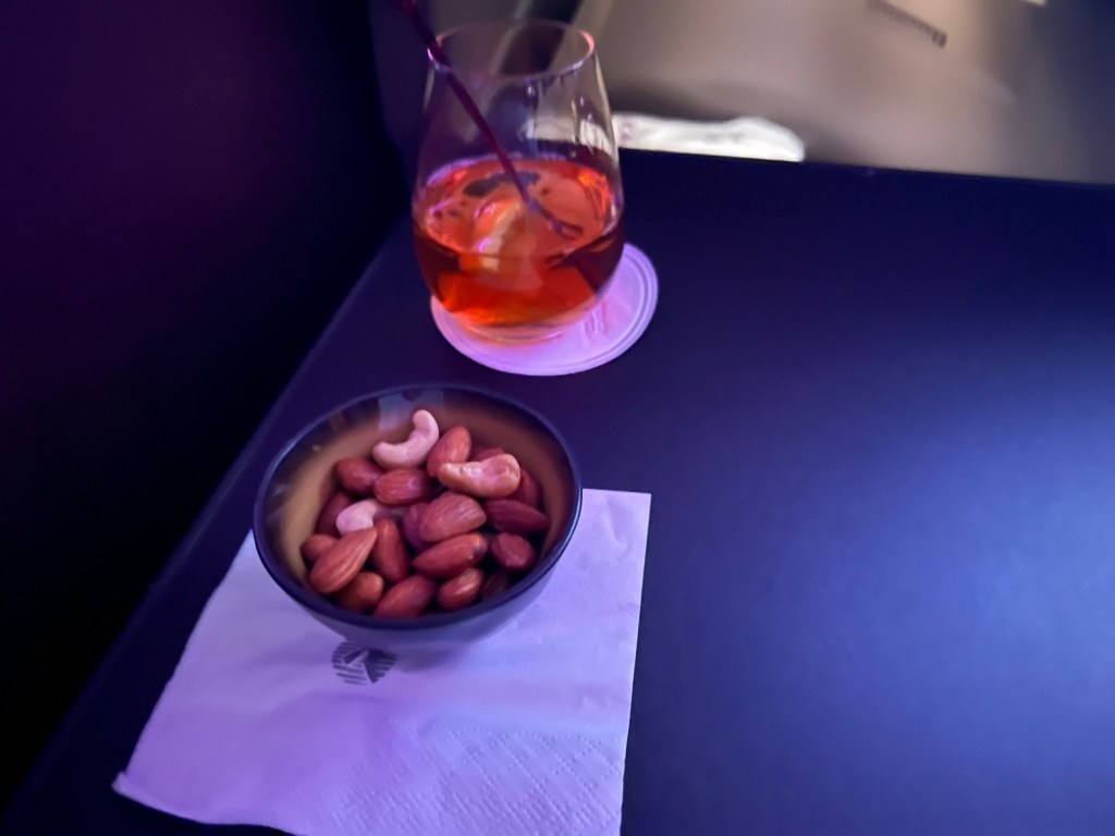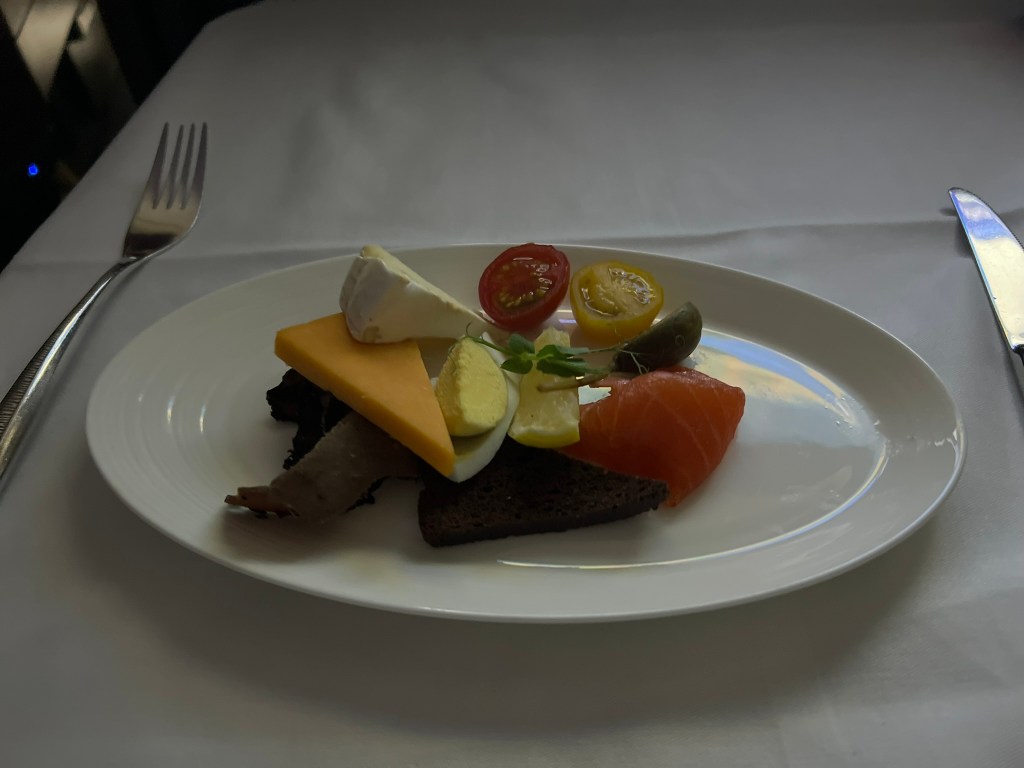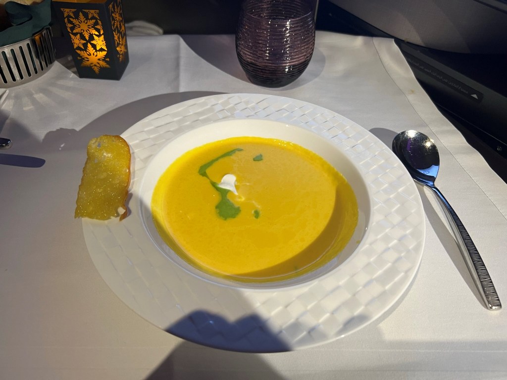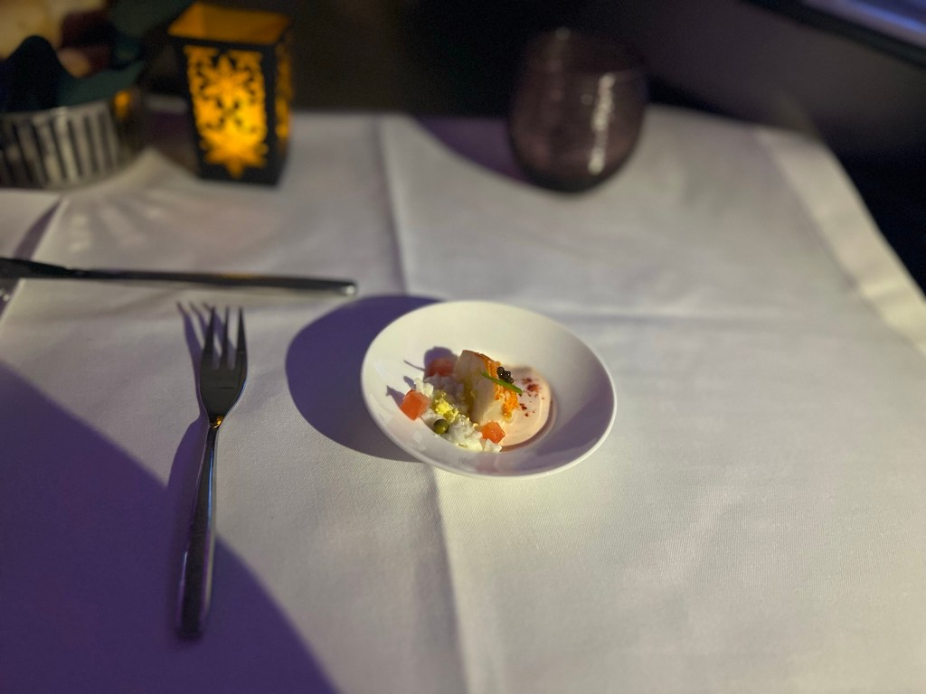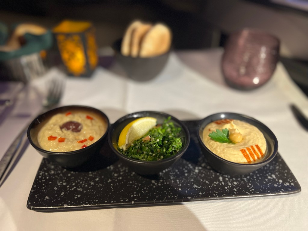 I logged in to get my free hour of Wi-Fi which all Privilege Club members are entitled to in business class. It was a bit spotty, but I was able to check emails. We all ordered dinner and then right on cue, the turbulence started. It wasn’t too bad at first and we received our amuse bouche and bread.