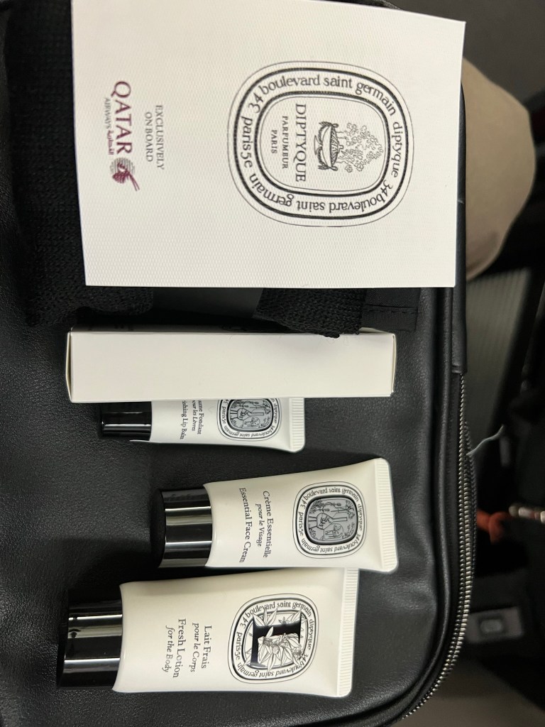 With those issues out of the way for now, it was time to enjoy the experience. We received pre-departure beverages and I asked for a glass of the rose champagne. We also were offered pajamas. The amenity kits were already in our seats when we boarded. I changed into the pajamas while economy was still boarding. Here is the amenity kit and contents. Women received a different style bag with different lotions.