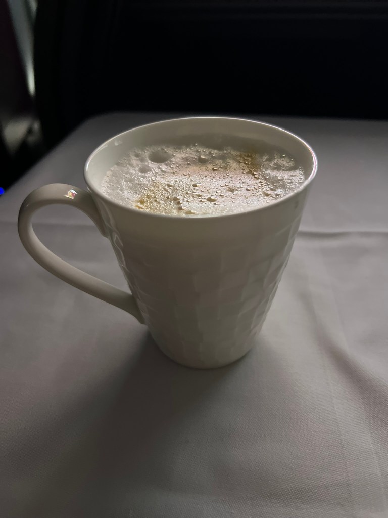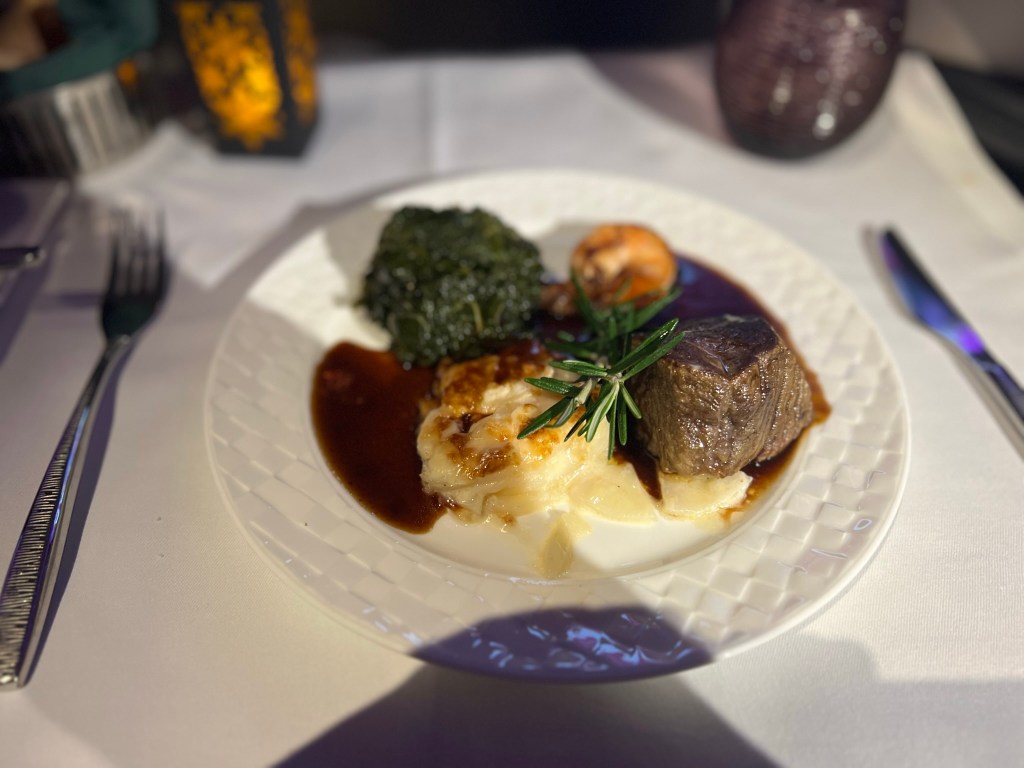 Then, the turbulence got significantly worse and the flight attendants were required to take their seats. Once they were allowed to resume service, my beef came out very well done. The “surf” part of the surf and turf was just a large shrimp. My older daughter ordered this as well and enjoyed it as she prefers well-done meat.