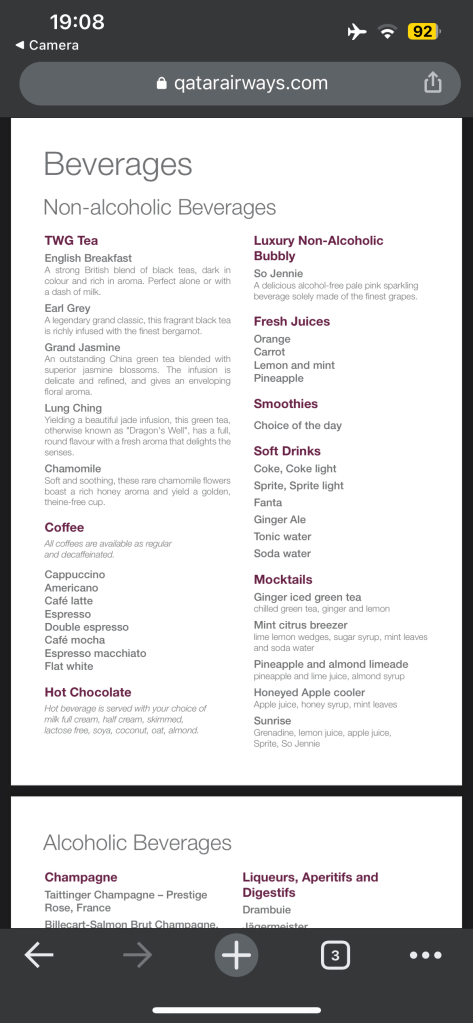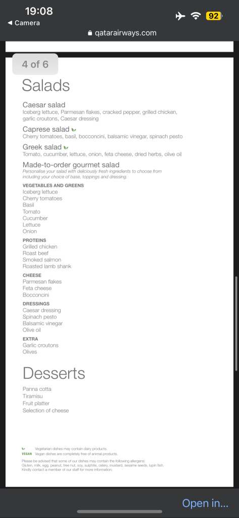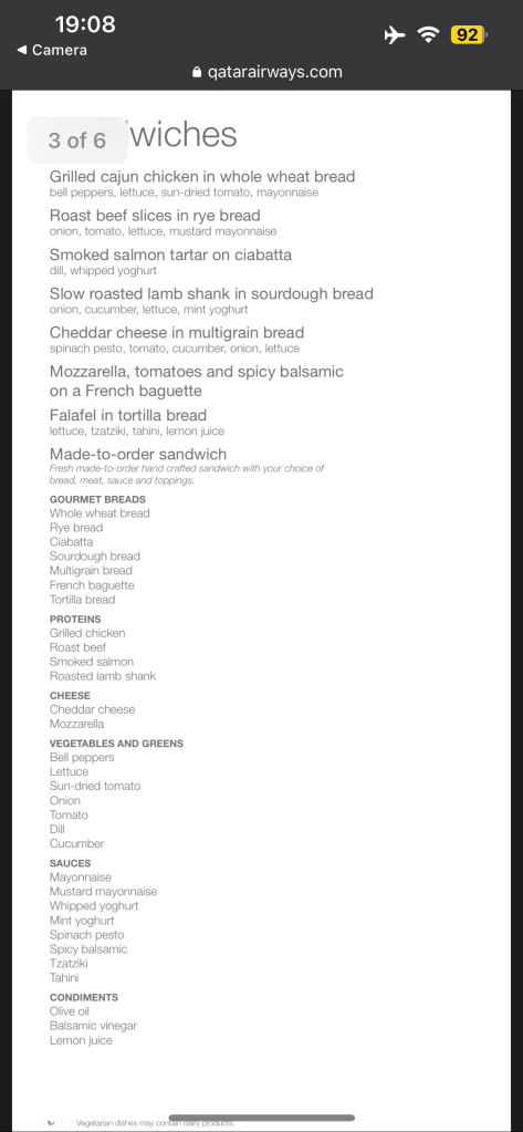 Most of the other food was pretty heavy for pre-flight dining. There were also some salads and sandwiches available in the deli area. They do not allow taking food from the dining areas to other seating areas. I suppose that makes for a cleaner lounge, but it was a bit annoying as we’re used to just grabbing food and bringing it to where we sit. Here are the menus for the deli which were available via QR Code. Beverages were the same in the main dining area.