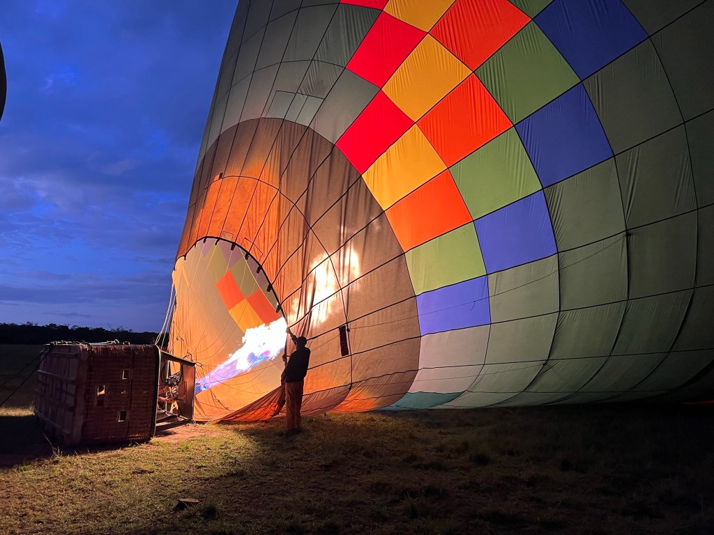 On our return to camp, we were given a briefing by the balloon company on how our excursion would operate the next morning. We had a 4:30am wake up call from the camp’s Masai warrior security guard and coffee at the reception area before our vehicle arrived at 5am to take us to the balloon launching site. The balloon left from another camp about 30 minutes away. On the way there, we drove through the local village and saw some hyenas on the road.
