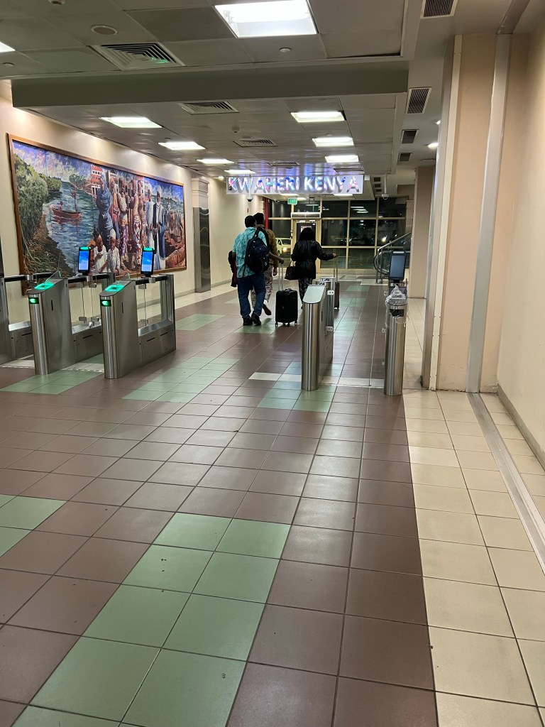 Around 11pm, we walked over to our gate, passing some nice looking shops and restaurants. Then we had two more passport checks before being allowed into the holding pen for the flight. On the whole, the terminal at Nairobi is much nicer than T5 at O’Hare.