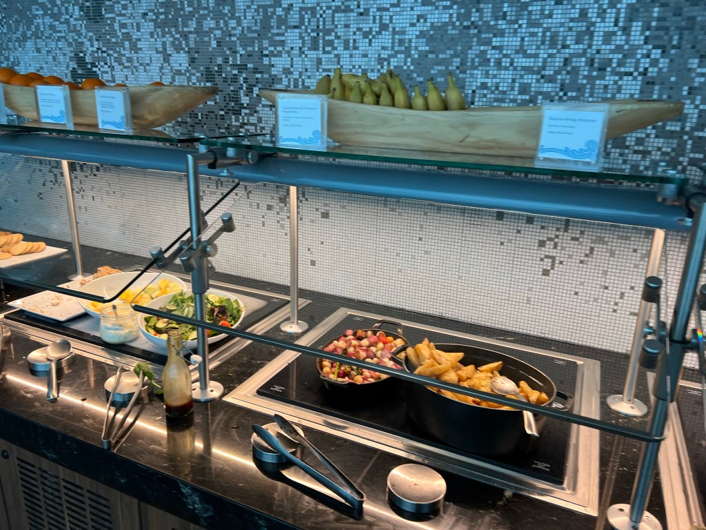 There’s a buffet on both levels (and another bar upstairs). We grabbed some food from the buffet. It was the usual Centurion staples of chicken thighs, potatoes, veggies and salads.