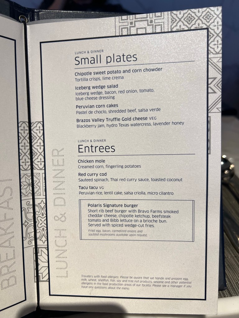 We first went to the dining area, thinking we would eat and drink something there first before relaxing, but we never actually left the dining area until it was time to board our flight. I did get some pictures of the menu: