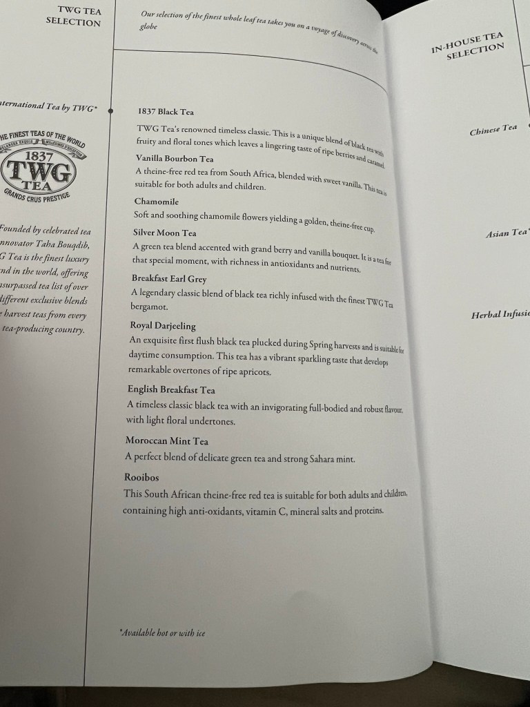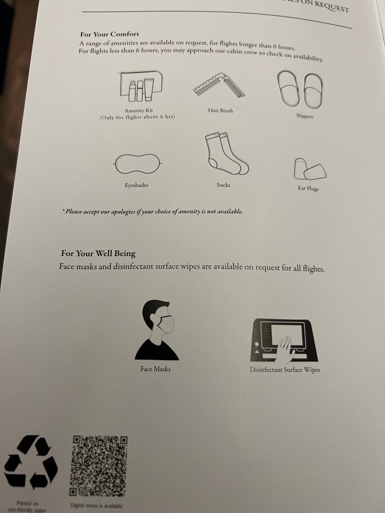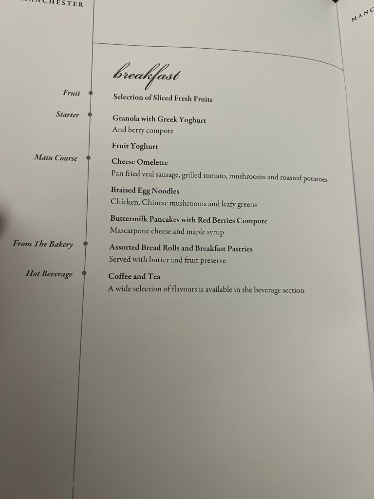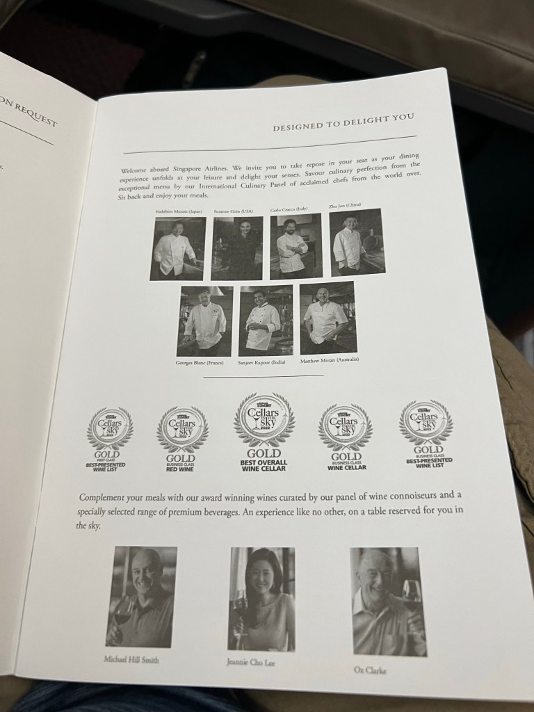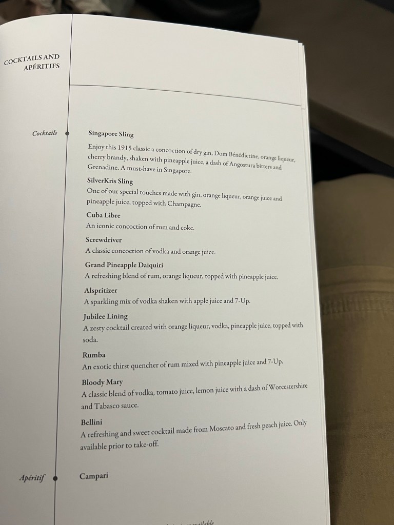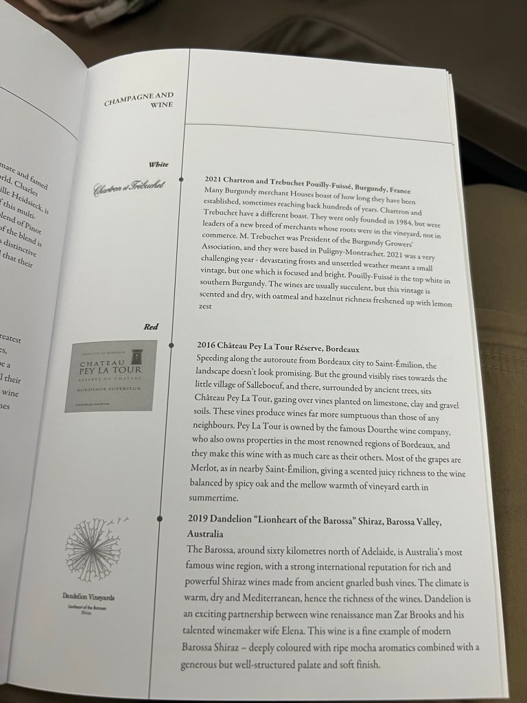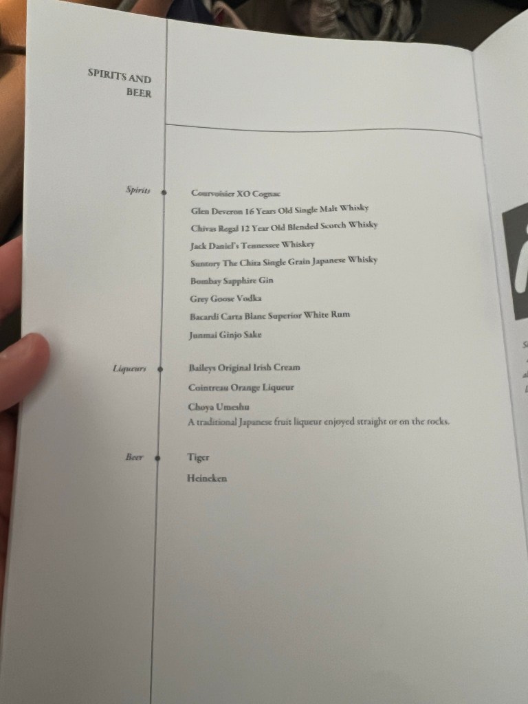 There was also a wine and beverage list. Of note, the menu contained the food options for both the Houston-Manchester flight and the Manchester-Singapore flight which is all one flight number.