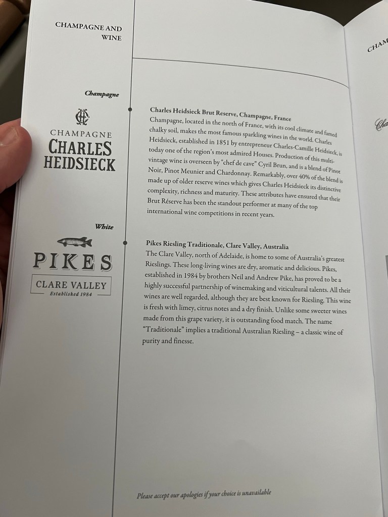 We were offered a predeparture beverage of champagne or juice and looked through the menu.