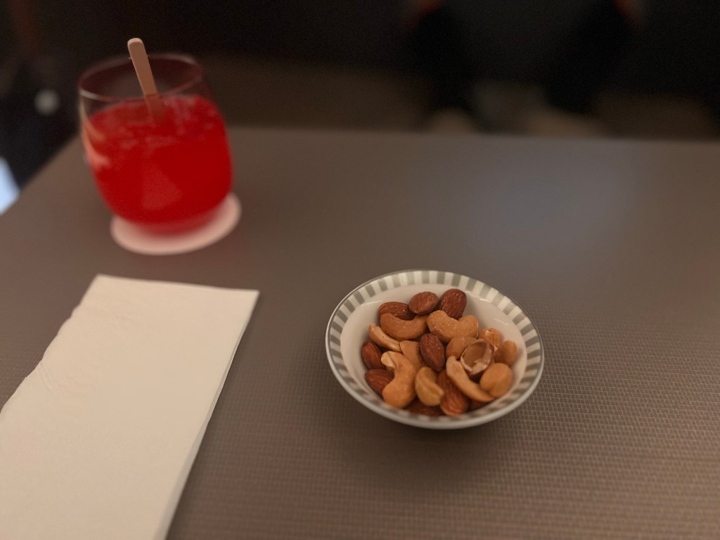 Drinks were brought to our seats directly. I ordered a Singapore Sling because, well, why not? It was brought with warmed mixed nuts.