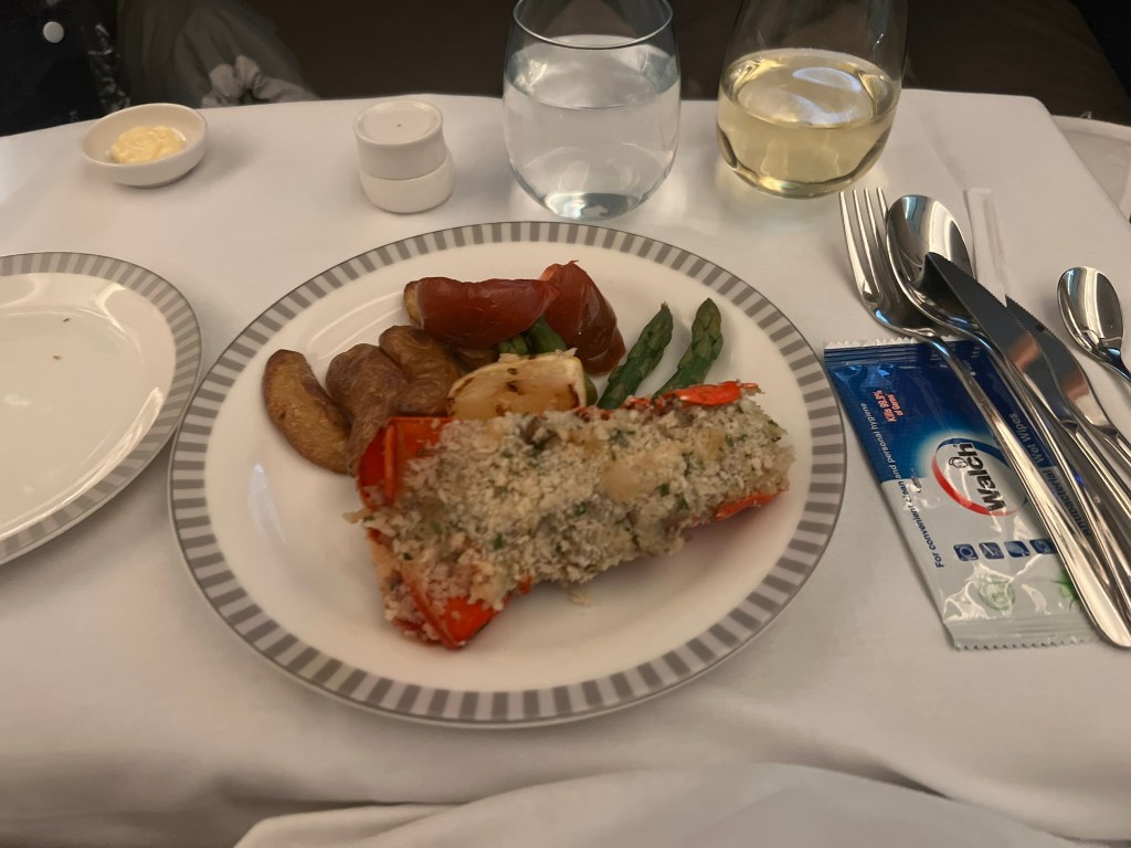 The meal service was a bit slow and I’m not sure if it was due to the turbulence or was just the normal pace for Singapore Airlines. Eventually we got served. My wife ended up being too full to get her pre-ordered entrée and just had the appetizer and dessert. I went for my lobster but skipped dessert. I tried the Chardonnay with dinner and it complimented the salmon and lobster nicely.