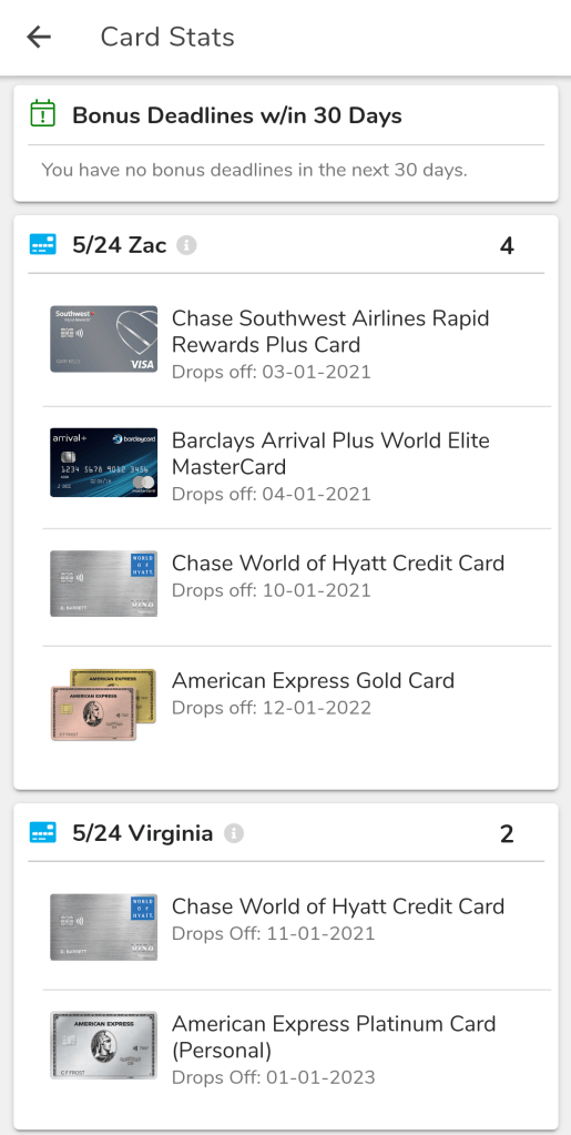 The app will also show you your card stats, including any upcoming sign-up bonus deadlines, and when your card drops off your 5/24 count: