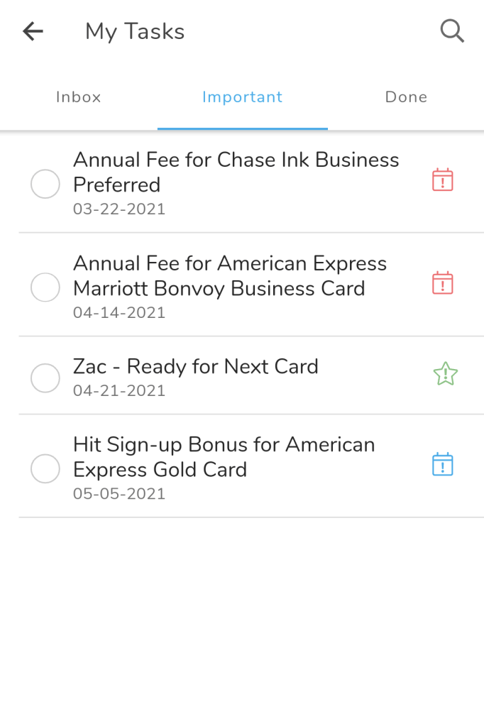 You can also see any upcoming tasks you need to accomplish with your cards, including annual fee payment (which will remind you to call for a retention bonus), sign up bonus spend and whether you are ready to apply for another card based on the various credit card company restrictions: