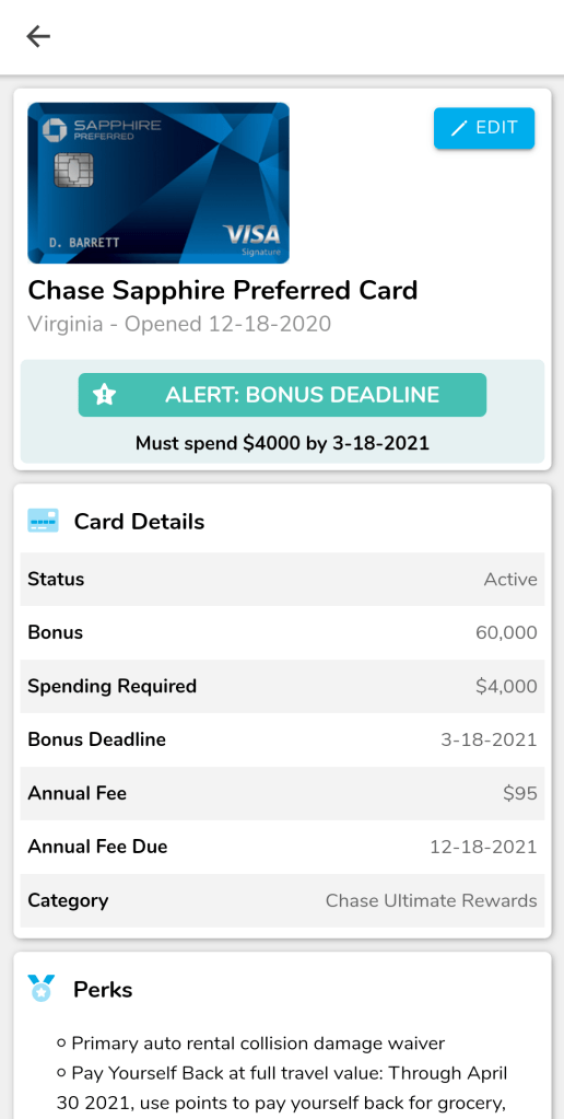 Finally, the app will also allow you to check your sign-up bonus deadlines in more detail (spend, date, bonus points) and current credit card features: