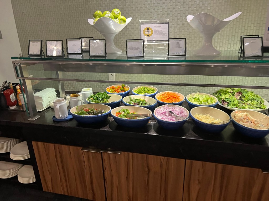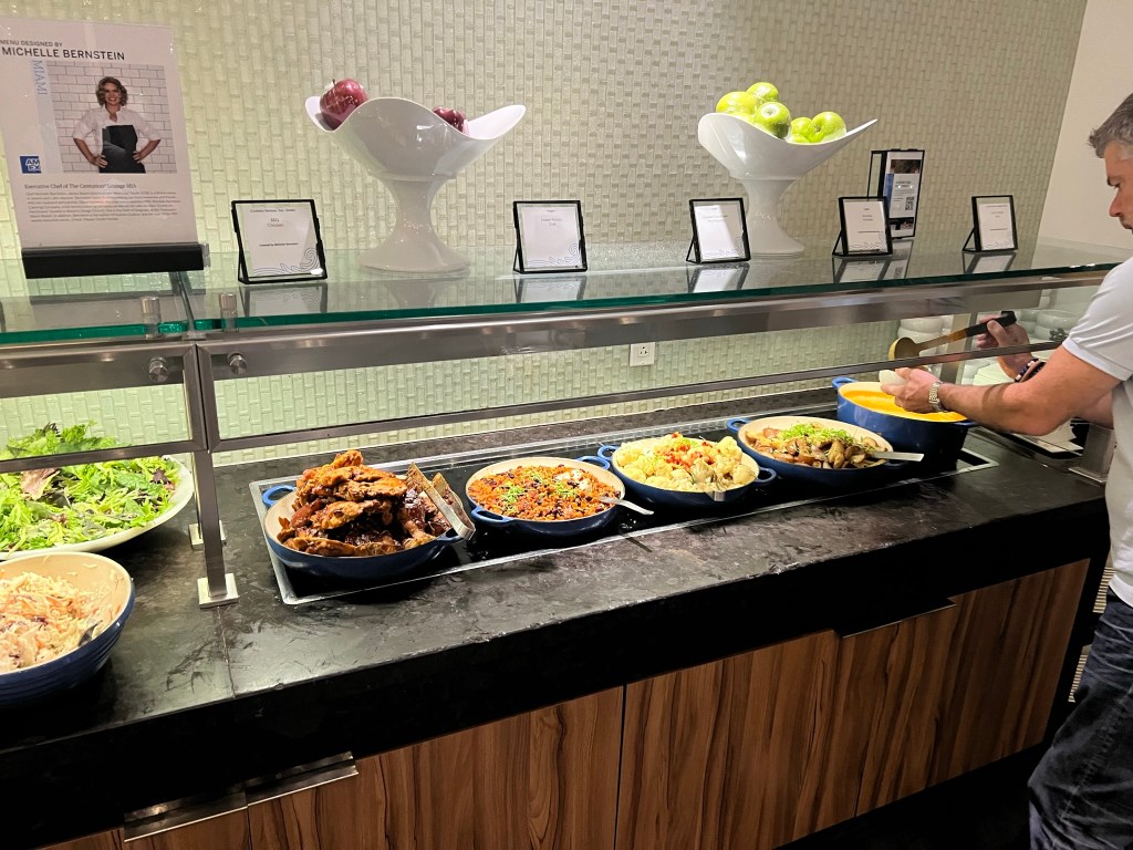 We were able to charge our devices and get some food and drinks. Although the lounge closes at 10pm, the staff stops replenishing the buffet at 9pm and the bar closes at 9:30pm. We had time to get some dinner and a cocktail. I tried a special cocktail with whiskey and rum but it was too strong so I just switched to an old-fashioned. The buffet was fairly standard Centurion fare with soup, BBQ chicken thighs, a couple of vegetable dishes, potato wedges and a salad bar. There were some cookies for dessert.