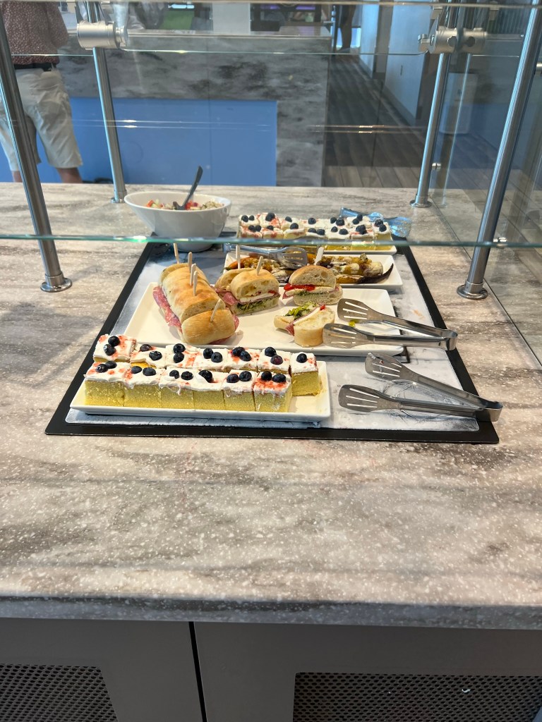 There were a few hot dishes including pasta and a chicken dish. There was a soup, some sandwiches and cake and cookies for dessert. There was a coffee machine and self-serve sodas/water. It was really nothing special. Most of the decent alcohol at the bar was only available for an upcharge.