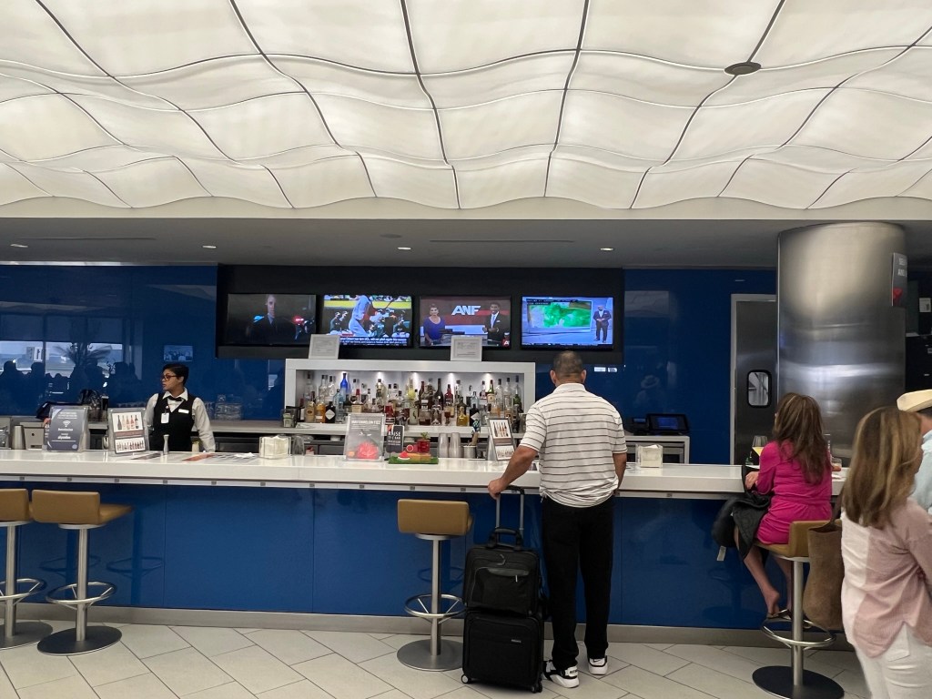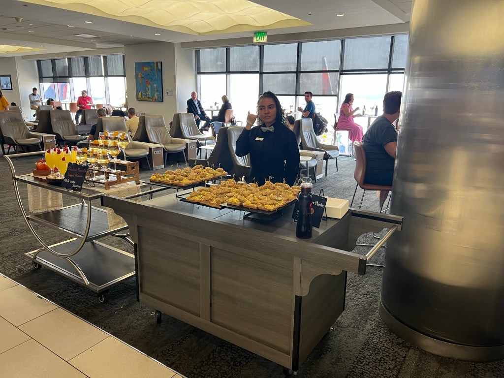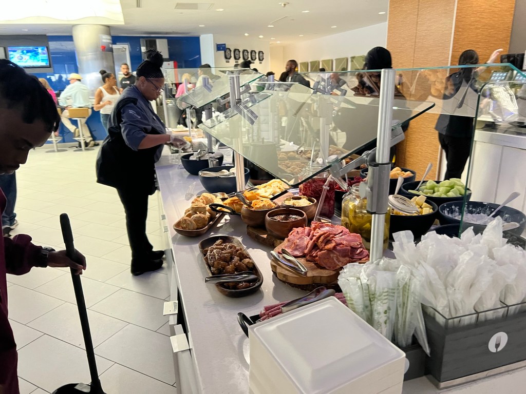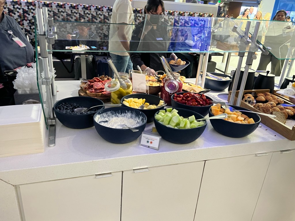 There was a nice breakfast spread, better than the usual Concourse A or B breakfast of egg bites, sausage and potatoes. There were also yogurt parfaits, charcuterie and even a special chicken and waffle/ pineapple mimosa display that was set up in a different area of the lounge.