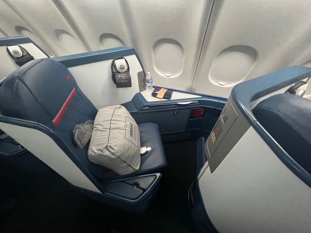 Waiting at our seats were a bedding package with blanket and pillow, noise canceling headphones, an amenity kit, water and slippers. We were offered a pre-departure drink of sparkling wine, orange juice or mimosa. I decided on the mimosa.