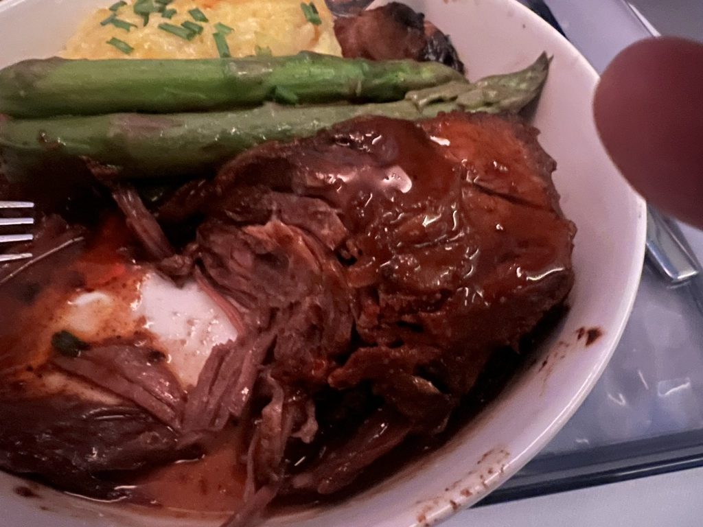 Lunch was served about an hour after takeoff, all on one tray. The food was actually very good. I ordered the Fox Bros. short ribs (a local Atlanta BBQ restaurant). It was served with red wine jus, saffron risotto, asparagus and cippolini onions.
