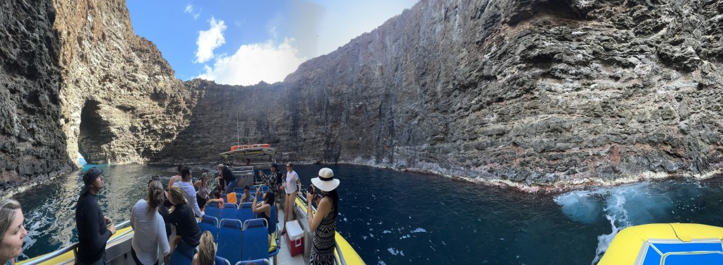 Last time in Kauai, we took a catamaran tour of the Na’Pali coast, but my wife got a bit queasy. She did not want to go on any more boat rides in the Pacific Ocean. So, on our second full day in Kauai, my wife stayed at the resort and I had a bit of an adventure on my own. I chose the “super raft” at Captain J’s tours because it combines the speed of an inflatable with the comfort of proper seating and even a bathroom on board.