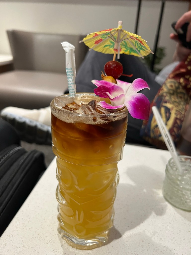 The bar was small but staffed. They did not have the premium liquors you see at other SkyClubs, just the standard included drinks. They did make a nice Mai Tai (as shown above). The staff was friendly and even brought around freshly baked cake slices on a cart for all of the passengers. Note that the bathrooms in the lounge are very small (but clean).