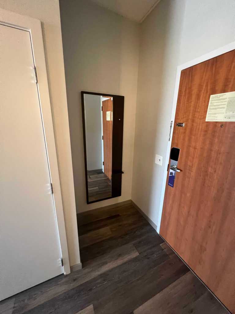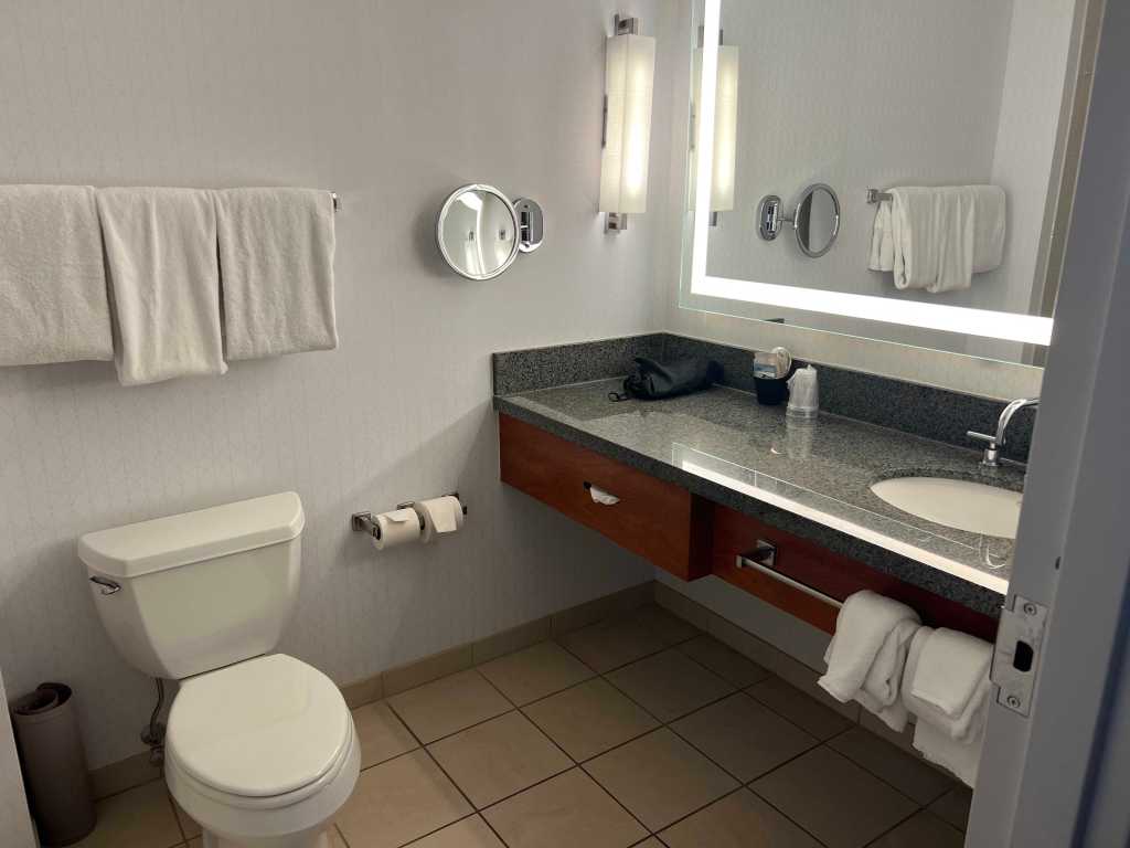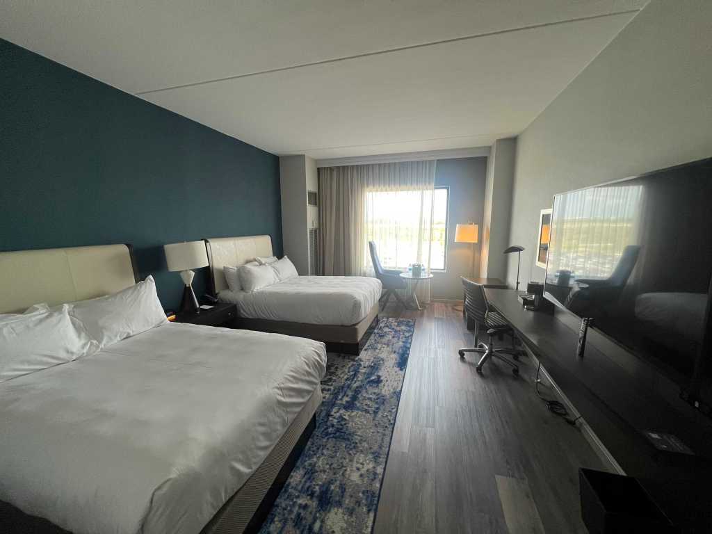 The hotel is connected to Pittsburgh Airport by an enclosed bridge that has moving walkways. It sits in the middle of the long-term parking lot and has runway views on both sides of the hotel. I arrived around noon on Friday and was at first told that it would cost an extra $50 to check in early, but after I pushed back a bit, the front desk rep said they would waive the fee. As a Globalist, I should be eligible for early check-in if the room is available. I had booked a King room but due to the early arrival was given the option for a room with two double beds and a runway view which was fine as I was traveling alone.
