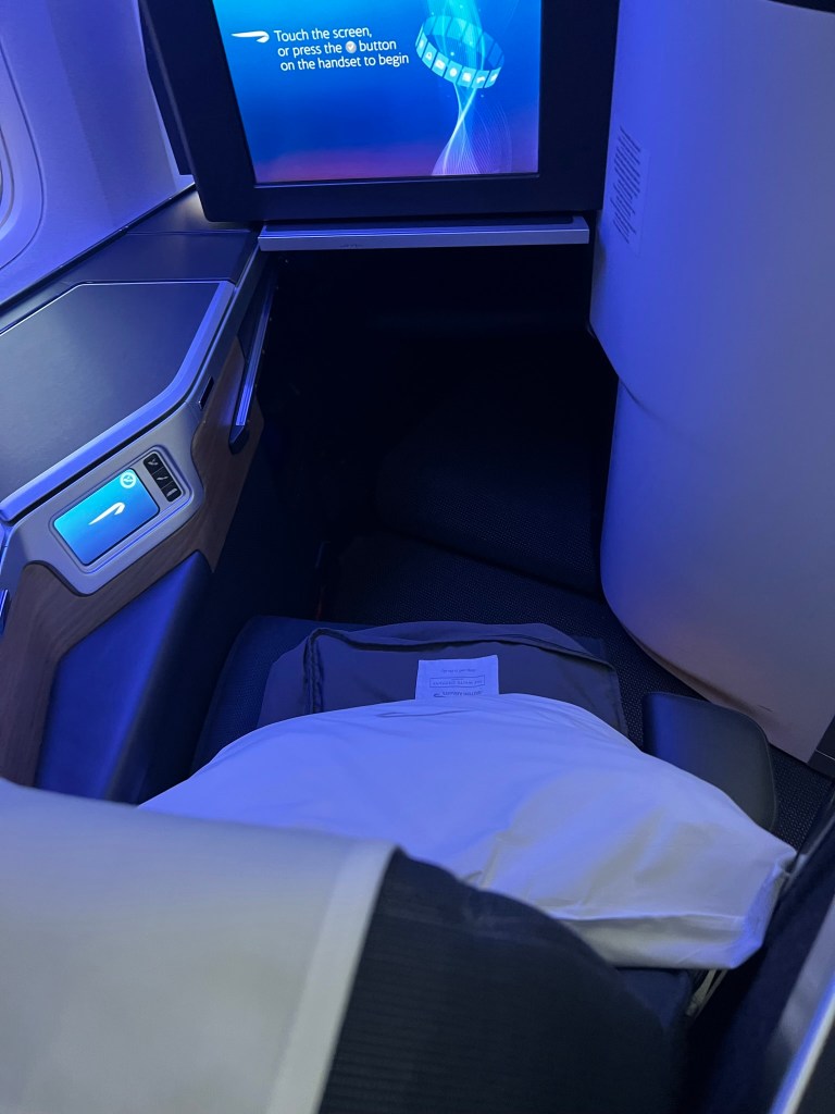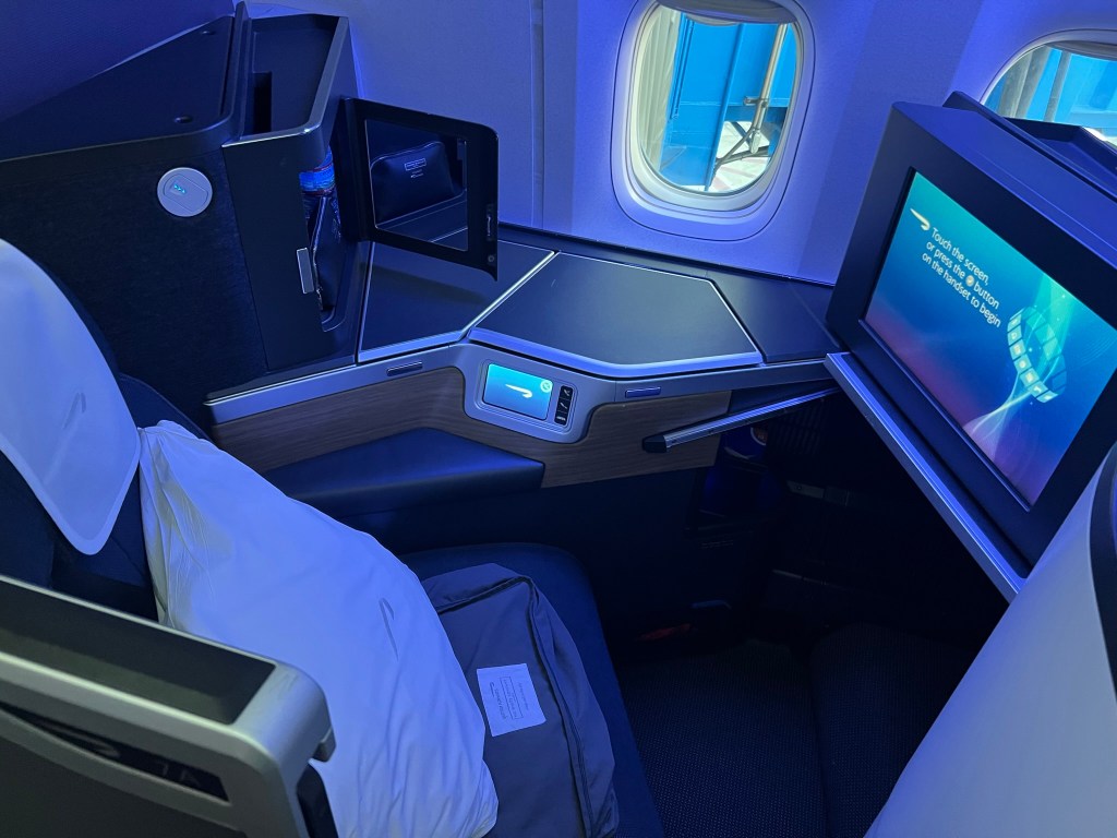 The seats had an electronic screen for controlling the recline, a small storage area above the shelf and a couple of storage areas on the shelf itself. In fact, as you will see in a later post, this seat is extremely similar to the American Airlines 787-8 seat on our flight home with one exception, the door. There was plenty of overhead storage for our larger bags.