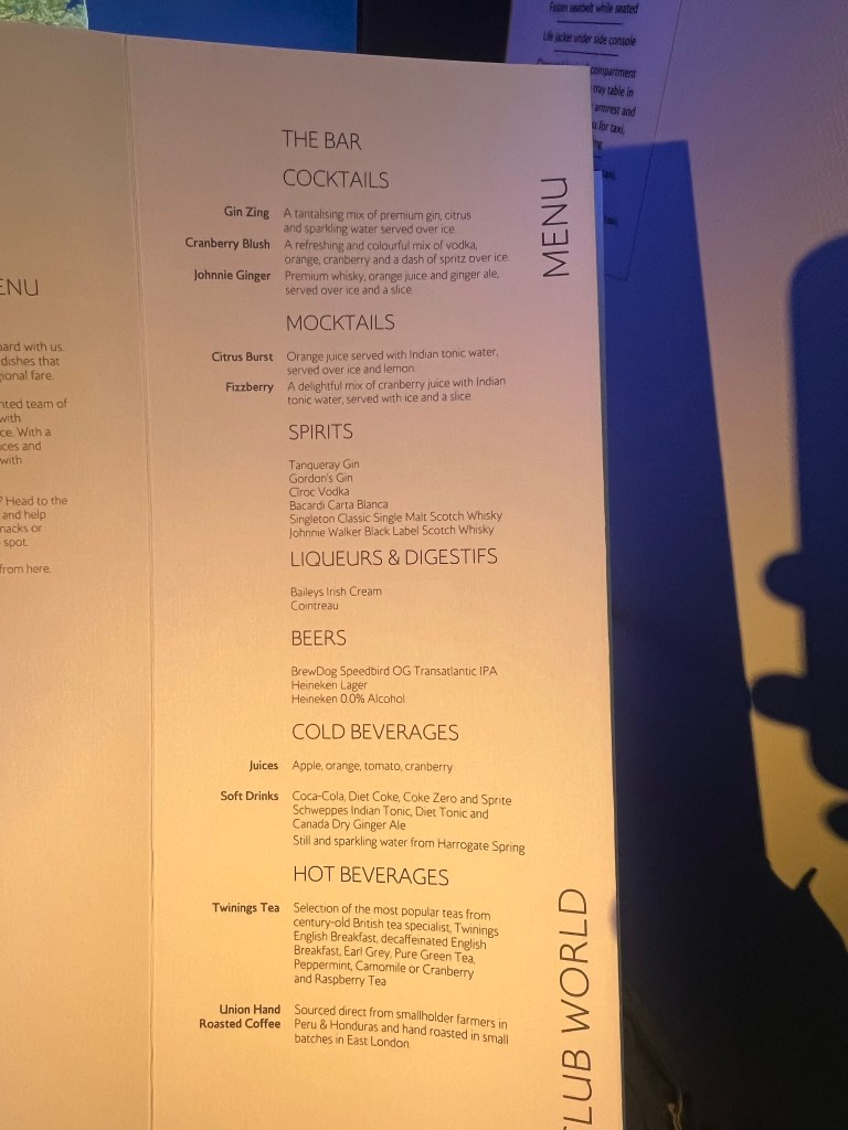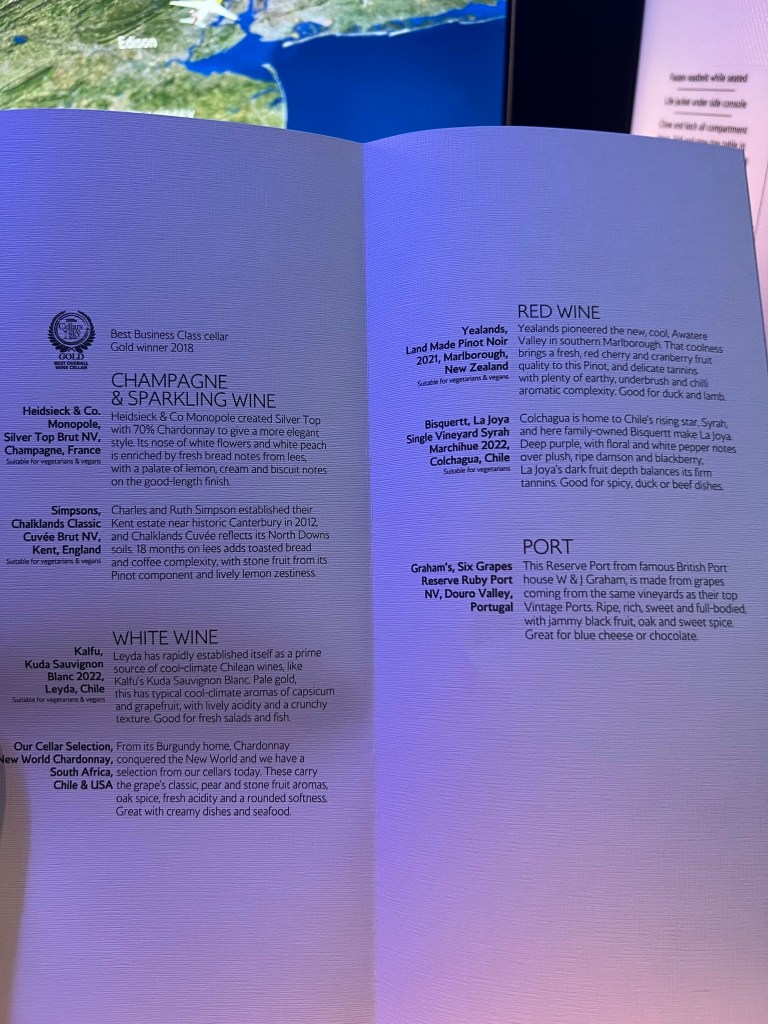 We pushed back a bit late and after a fairly long taxi, we were wheels up around 6:45pm. I perused the menu (sorry for all the shadows).