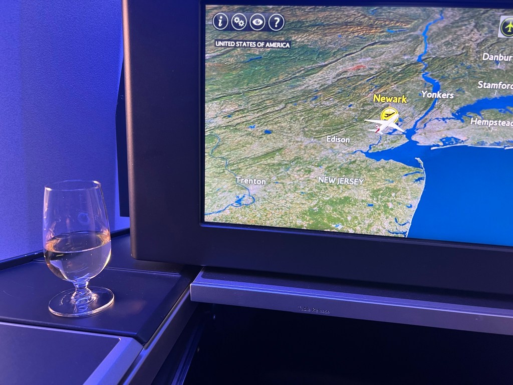 Around 20 minutes after takeoff, drinks and packaged nuts arrived. The glassware for my scotch was nice.