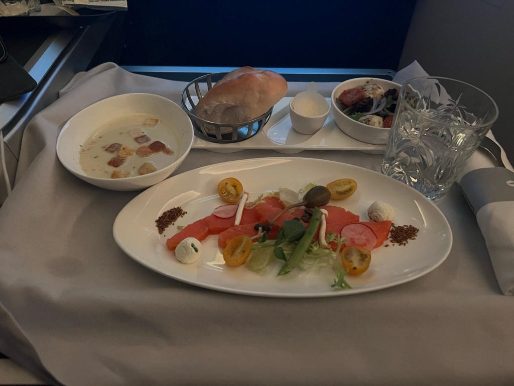 While the salmon appetizer was good, the soup was a bit lukewarm, which was a shame as it was quite flavorful. I do enjoy a nice bowl of soup on a plane when it’s done right. The small side salad with mozzarella and tomato was more interesting than the usual bland offering. Warm bread was also provided.