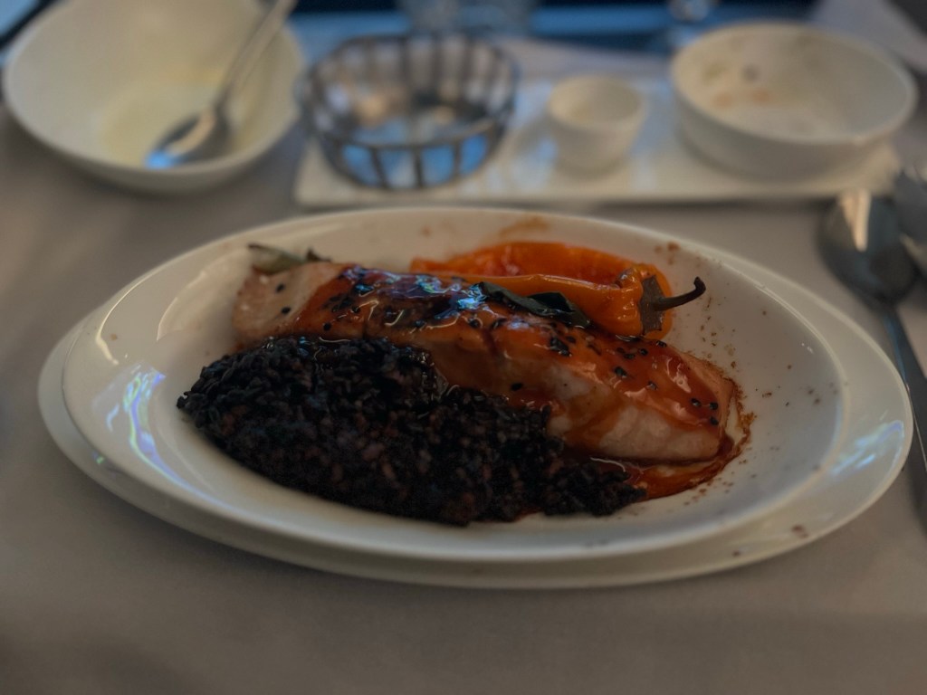 While it doesn’t look super appetizing (bad plating by the flight attendant), the salmon teriyaki and sticky rice was very good. We can talk about having salmon as both an appetizer and main course, but on the whole the meal was much better than I expected.