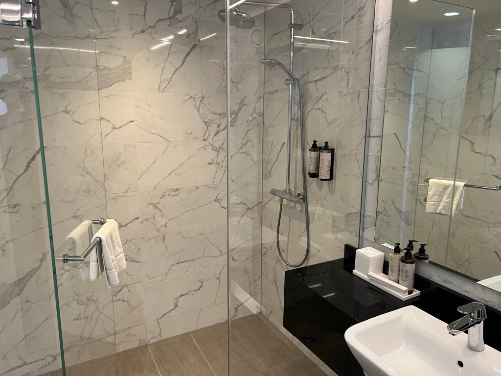In terms of the suite itself, the king-sized bed was very comfortable. The bathroom had a single sink and no separate W/C. The rainfall shower was strong and the hotel uses refillable toiletries. In fact, they also use cardboard water bottles which were fine for keeping in my jacket pocket while we walked around Dublin.