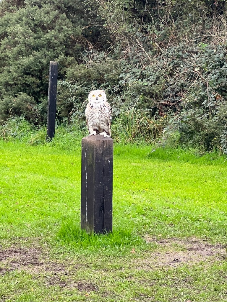 We got to meet three different owls and a hawk. We basically held out a thick glove with some food (chicken feet) for the birds to come land on our arm and eat the food.