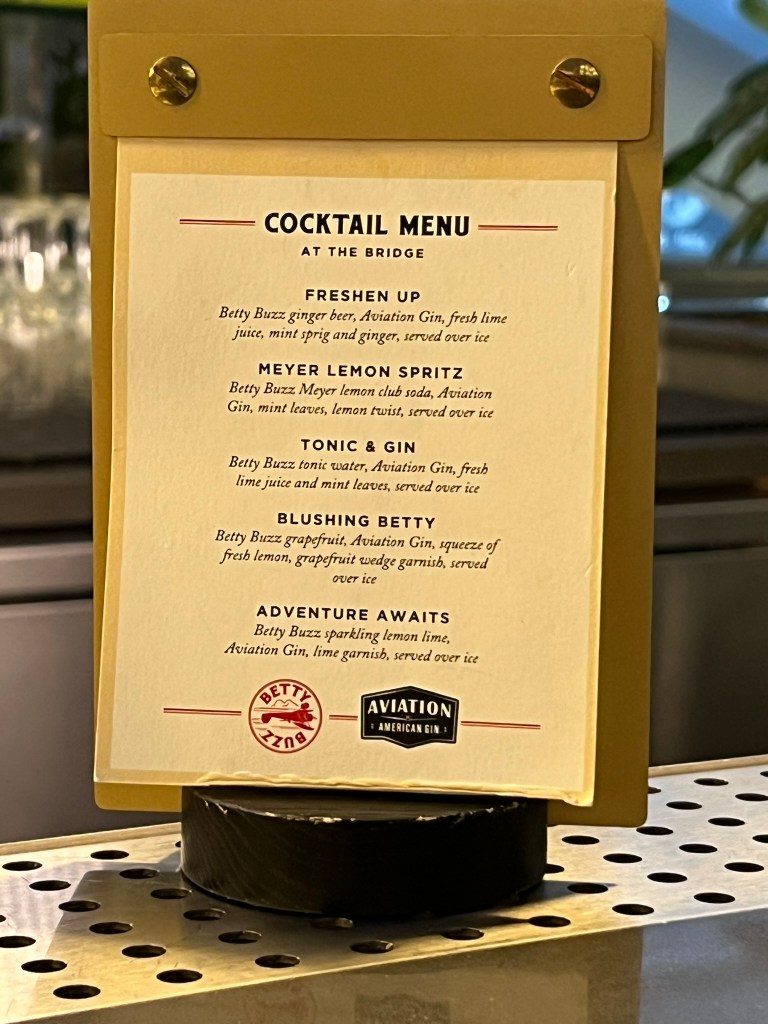 Further on into the lounge, there’s the Tasting Room, offering Brooklyn Brewery beers on tap and some tables and booths where you can order a few bar snacks and drinks. Then at the very back there’s the Bridge Bar, which when I arrived around 6pm, was blessedly empty. I grabbed a seat at the bar and ordered some food and a drink from the bartender.