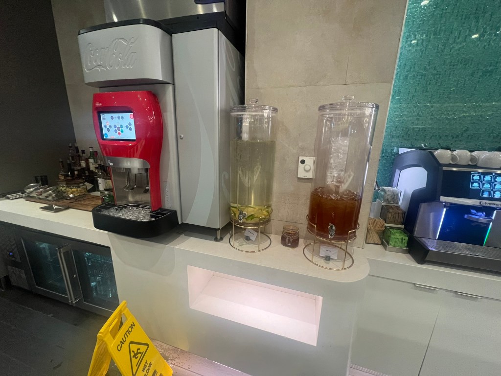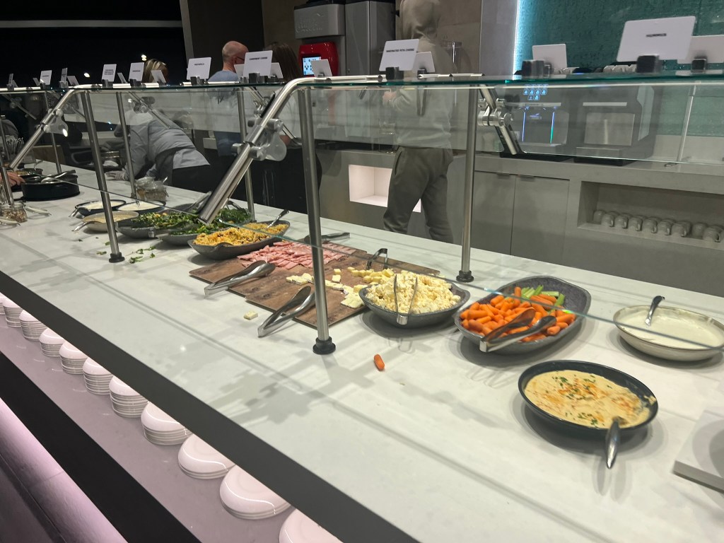 The lounge is set up with a few different areas. There’s a main seating area that is huge (and crowded) with showers and bathrooms at the far end and a buffet and self-serve drinks area on the side. There are several shower suites plus plenty of bathrooms so there was not a wait for either when I was there despite the crowds.