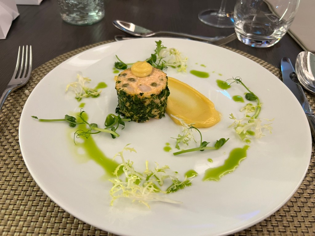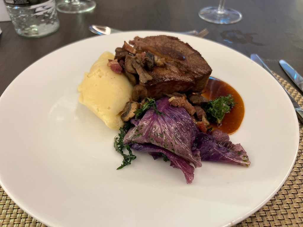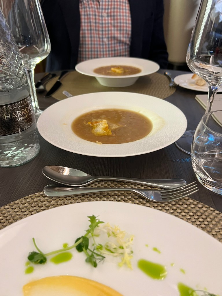 We enjoyed our pre-match meal and ordered drinks and dessert for halftime. I had the salmon appetizer, the onion soup and the ox cheek. The ox cheek was basically short rib, and was a bit tough and fatty.
