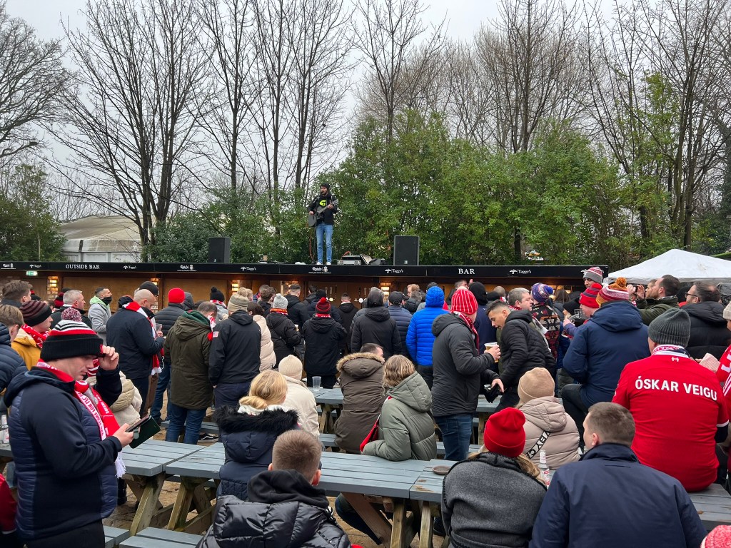 We took an Uber to Taggy’s Bar, which is a beer garden inside the Hotel TIA near Anfield. We enjoyed a pre-match beverage and the musical entertainment.