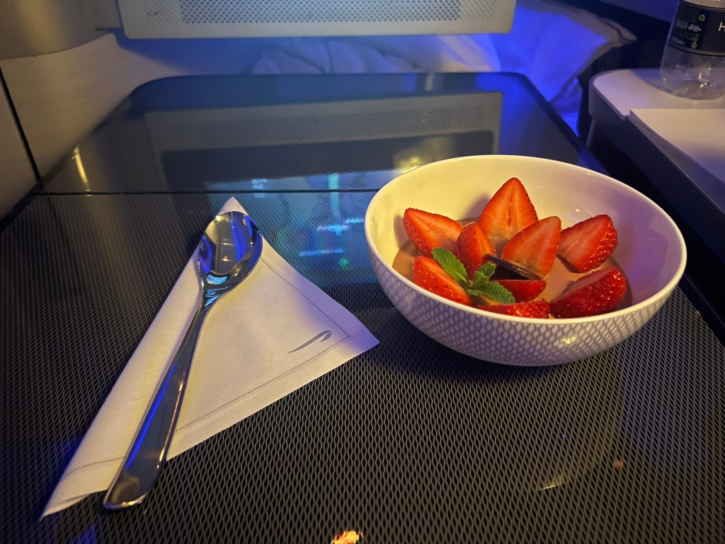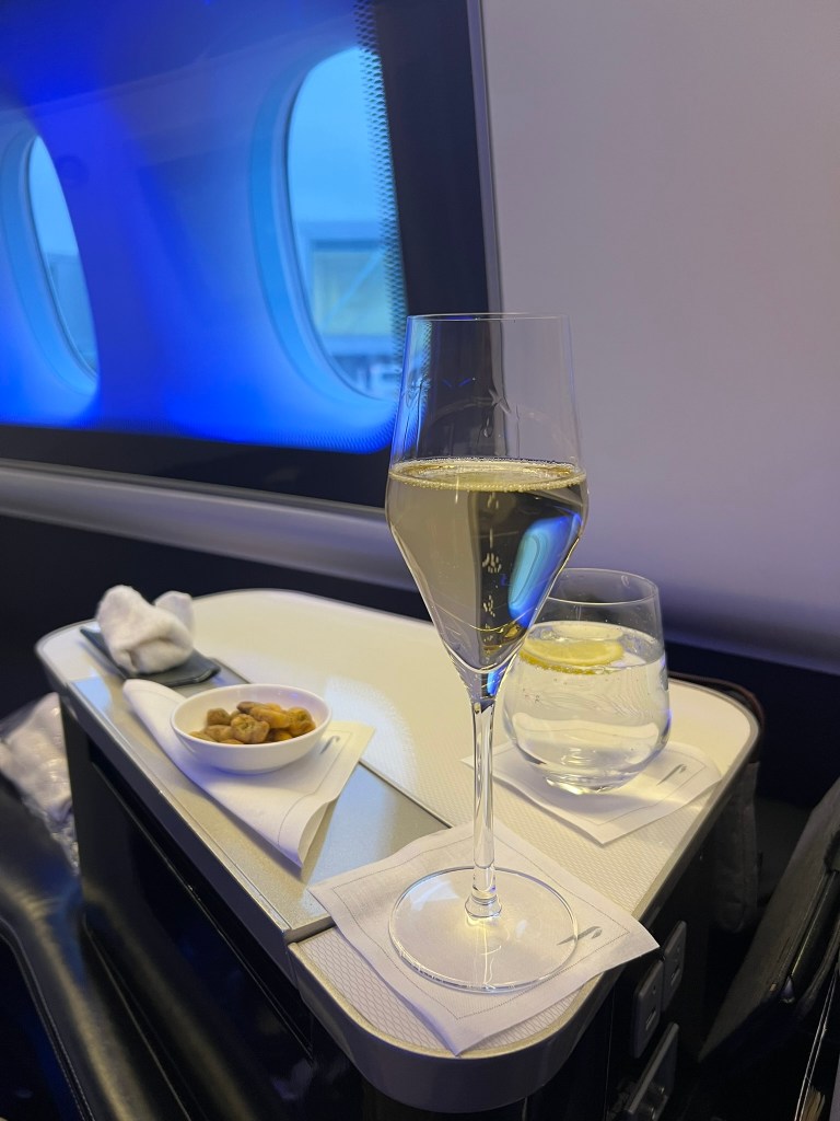 We boarded a few minutes late and I was still sweating from my connecting flight exertions. The friendly flight attendant escorted me to my seat (2K). I asked for champagne, club soda and a cold towel which were promptly delivered along with mixed nuts.