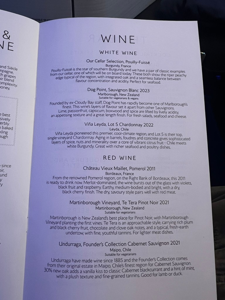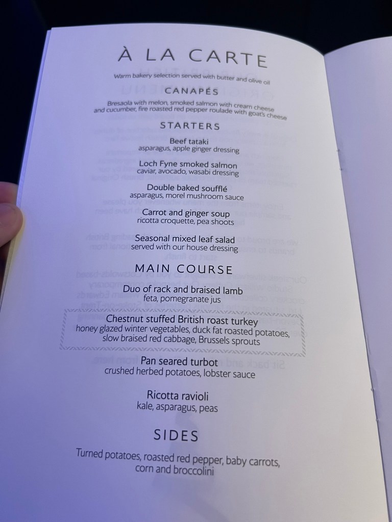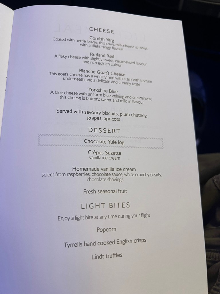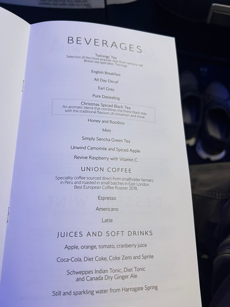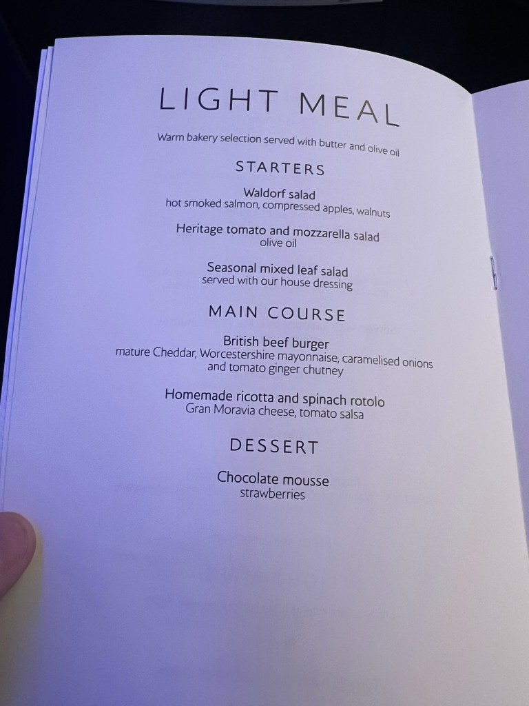 I had a look at the menu and provided my choices to the flight attendant. Service is totally a la carte so I could have had my first meal later, but I was hungry given the lack of catering on my connecting flight from Manchester.