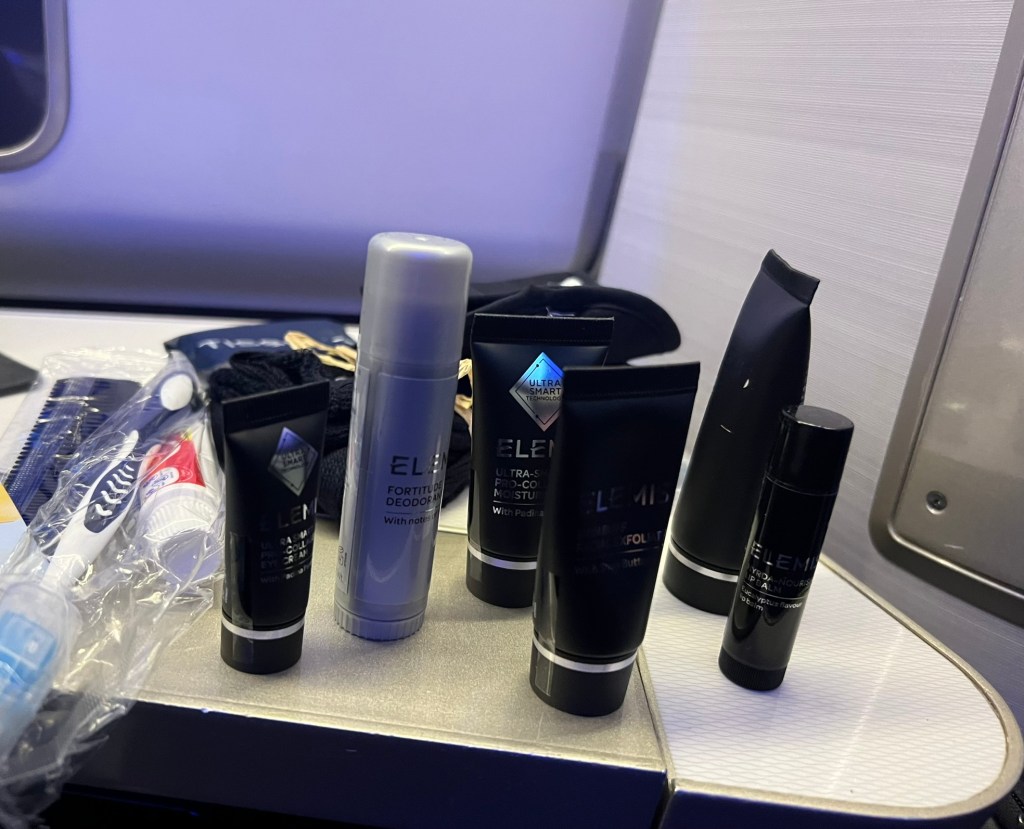 My proactive flight attendant brought me a “lounge suit” AKA pajamas as she could see I was still kind of discombobulated from my run through the terminal. I washed and changed into the comfortable loungewear.