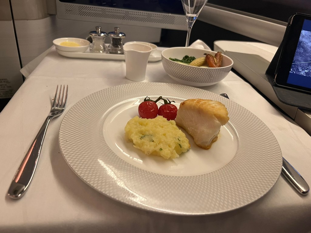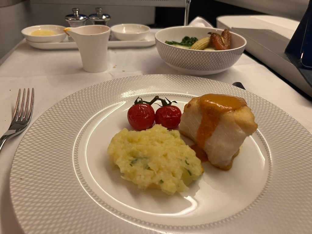I was told they had run out of the first class smoked salmon appetizer, but I could have the one from business class if I wanted, which was fine. It was actually similar to the dish served on my flight from London to Manchester the previous week, just on a nicer plate.