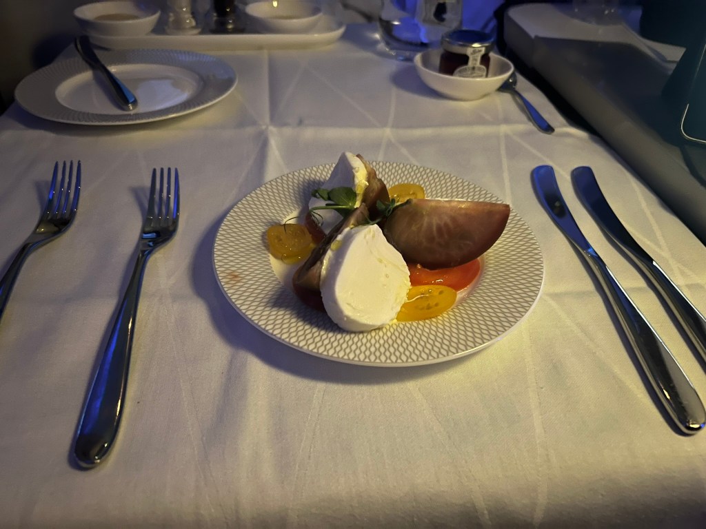 About 90 minutes before landing, I had the second meal. I started with the caprese salad.