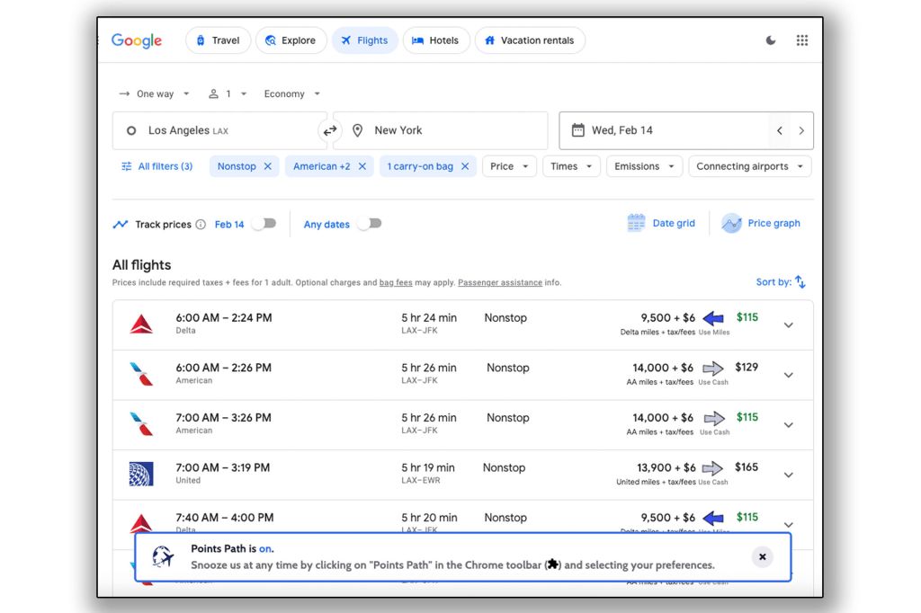 Points Path is an new extension that can be downloaded to your Google Chrome browser. It pops up points and miles prices alongside the cash prices of the flights that you search for in Google Flights.