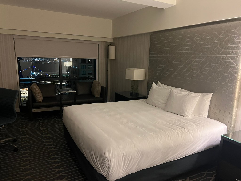 We arrived at the Manchester Grand Hyatt around 8:30pm after a fairly quick Uber from San Diego airport. I had communicated with the hotel via text and originally asked to be in the Seaport tower (the shorter one pictured above) as I was told by friends it was more recently renovated and quieter. However, the hotel rep assured me that the Harbor tower (the taller one) was also renovated and would be closer to the lounge. In the end, because of my wife’s mobility issues (still using an ankle boot), I went with the hotel’s suggestion to limit the amount of walking she would have to do.